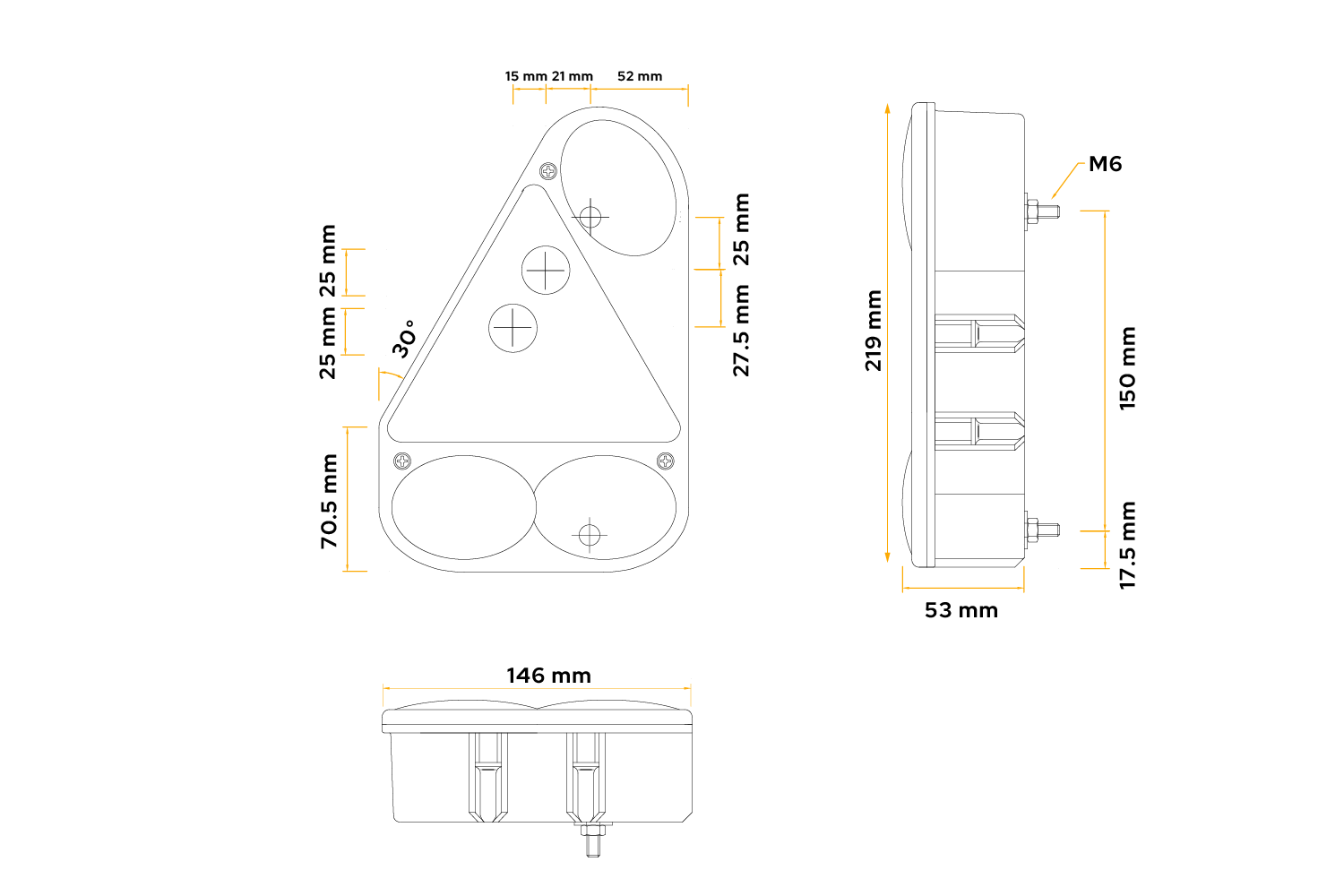 Et sett med to EARPOINT III baklykter fra ASPÖCK, designet for montering på venstre og høyre side av kjøretøyet , er 146 mm brede , 219 mm høye og 53 mm dype . Begge lyktene er utstyrt med 5-pinners bajonettkontakter for rask og enkel montering. i tilhengere, busser eller trailere .
