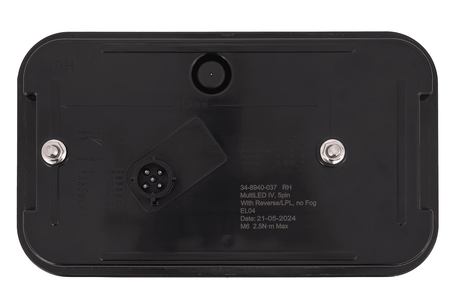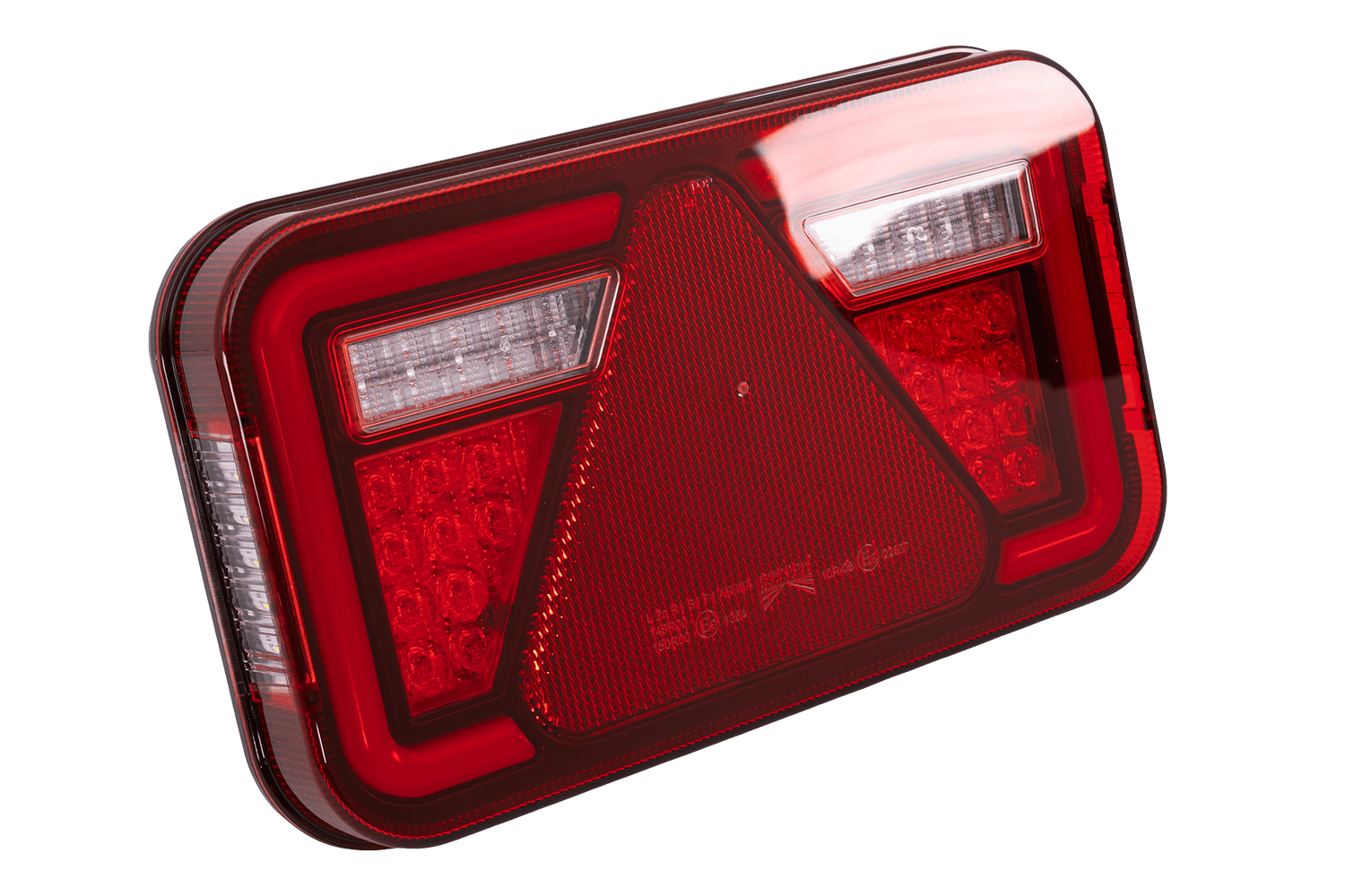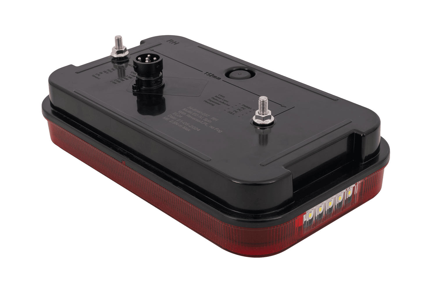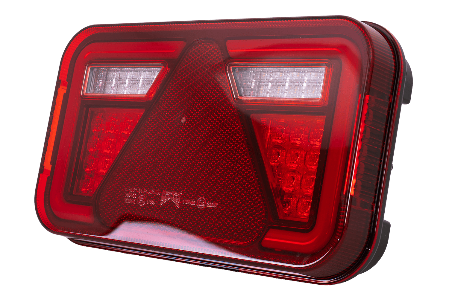 • MULTILED IV ASPÖCK baklykt er designet for montering på høyre side. Den tilbyr seks funksjoner: posisjonslys, bremselys, ryggelys, blinklys, nummerskiltlys og en reflektortrekant.