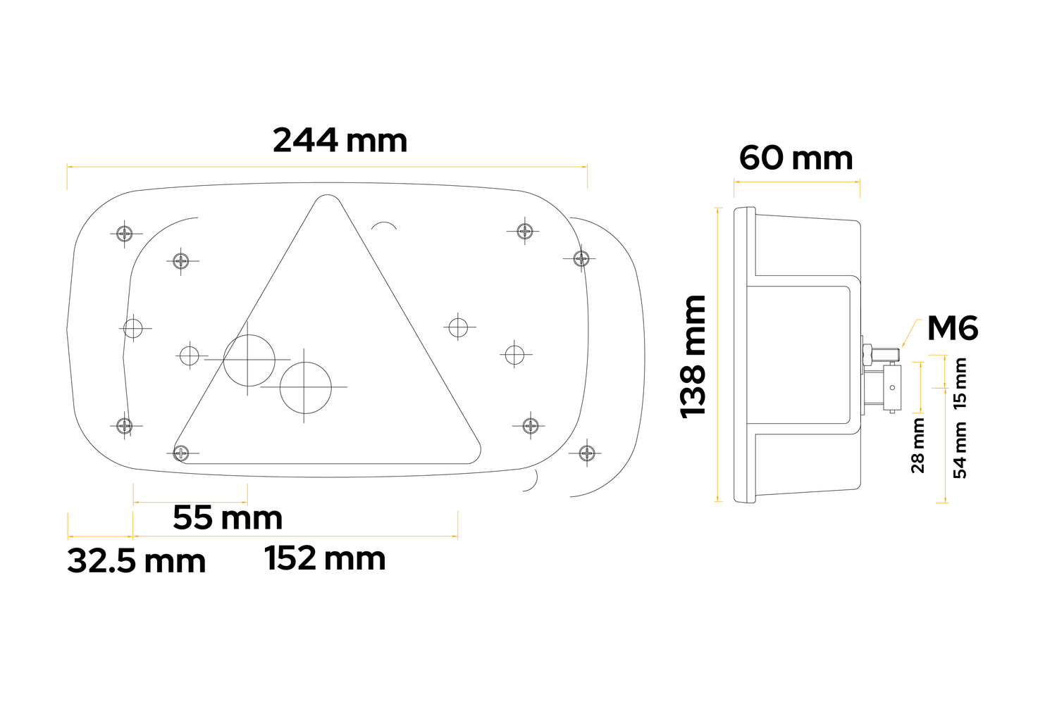 Multipoint III baklykt fra ASPÖCK er beregnet for montering på venstre side av kjøretøyet og har følgende dimensjoner: bredde 244 mm, høyde 138 mm, dybde 60 mm . Utstyrt med en 8-pinners bajonettkontakt , gir den enkel og rask installasjon i tilhengere, busser og bergingsbiler .