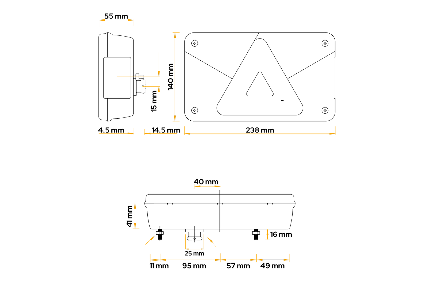 Multipoint V LED-baklykt fra ASPÖCK er beregnet for montering på høyre side av kjøretøyet og har følgende dimensjoner: bredde 238 mm, høyde 140 mm, dybde 55 mm . Utstyrt med en 5-pinners bajonettkontakt , gir den enkel og rask installasjon i tilhengere, busser og bergingsbiler .