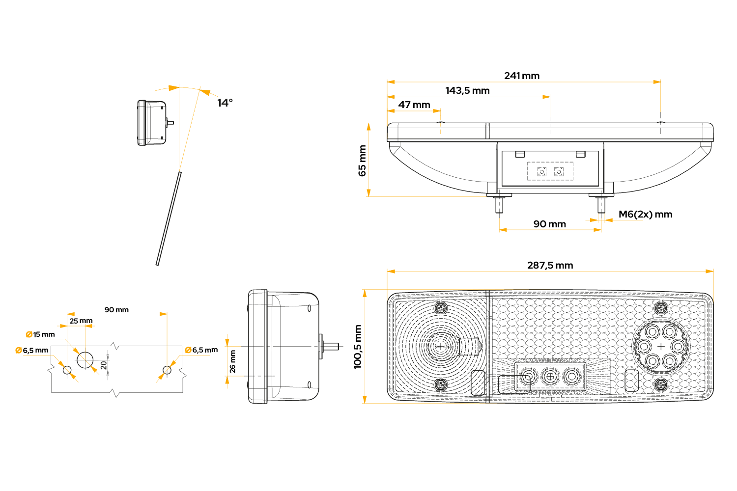 WE549L baklykt fra WAŚ er designet for montering på venstre side av kjøretøyet , og har følgende dimensjoner: bredde 287,5 mm, høyde 100,5 mm, dybde 65 mm . Det er en gjennomføring på baksiden av lampen som gjør det enkelt å koble til kabelen, noe som gjør den til en ideell løsning for bruk i tilhengere, busser og bergingsbiler .