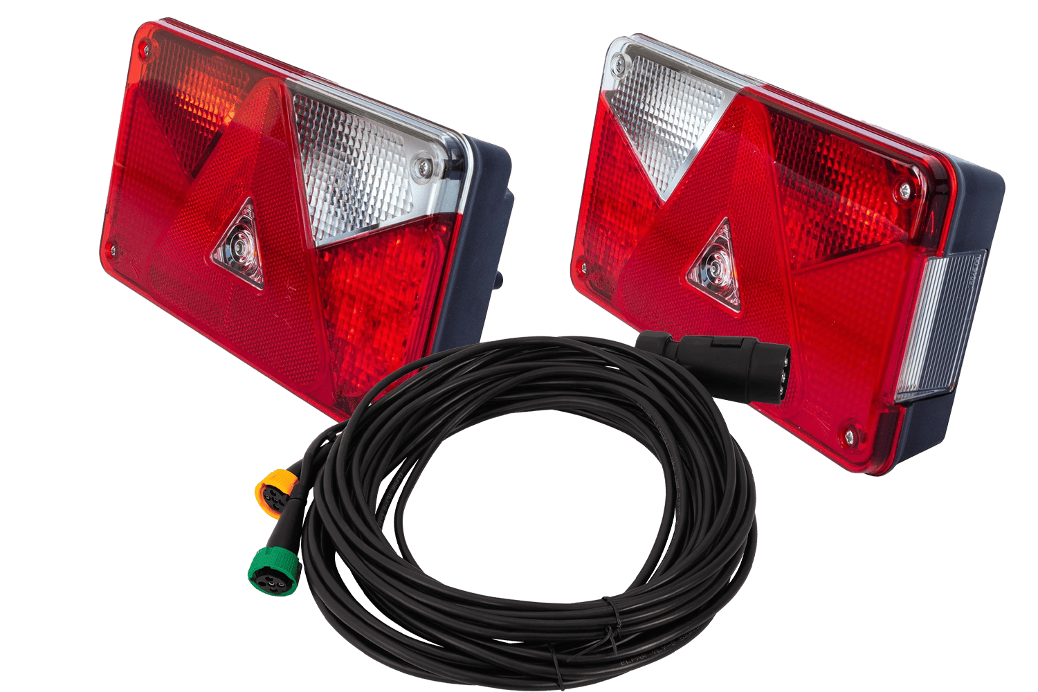 • Lyssettet for tilhengere og bergingsbiler er en elektrisk løsning som forbedrer sikten og trafikksikkerheten. Settet består av ASPÖCK MULTIPOINT V LED-baklykter og et MANTES ledningsnett med en lengde på 7 m og en 7-pinners plugg.