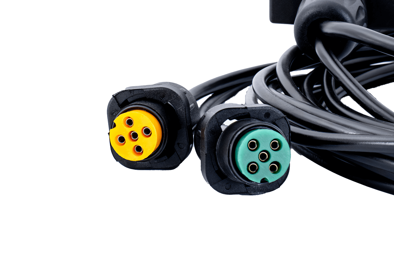 Ledningsnettet er utstyrt med to 5-pinners bajonettkontakter for tilkobling av baklysene. Bajonettsystemet sikrer rask og sikker installasjon, og eliminerer risikoen for utilsiktet frakobling under kjøring. Kontaktdesignet garanterer en vanntett tilkobling og beskytter kontaktene mot korrosjon, noe som sikrer langvarig og problemfri drift av hele tilhengerens belysningssystem.