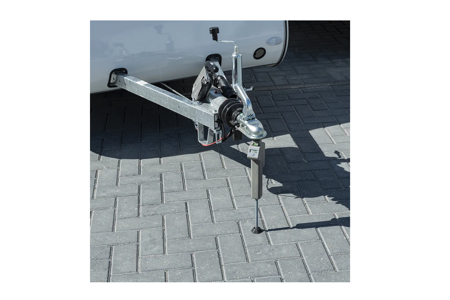 Denne modellen er utstyrt med et tydelig digitalt display som gir kontinuerlige og presise avlesninger ved lasting av tilhenger. Et innebygd vater forenkler korrekt plassering av enheten, noe som øker målenøyaktigheten.