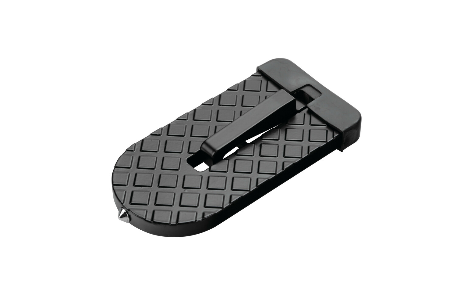 Montering i låselåsen tar bare noen få minutter og krever ingen verktøy. Etter bruk kan tilbehøret enkelt oppbevares i hanskerommet eller bagasjerommet. Trinnet er laget av aluminiumslegering , og en ripebestandig gummibakside beskytter lakken og dørstolpen.