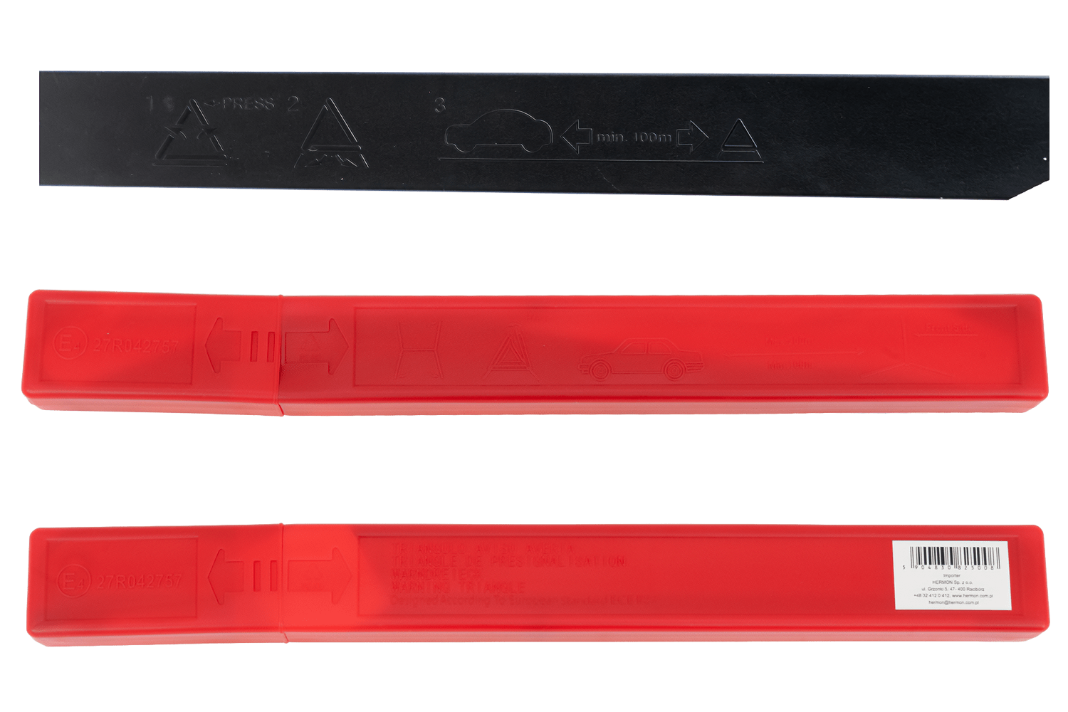 Takket være dimensjonene på 430x430x430 mm og den reflekterende overflaten er trekanten godt synlig på avstand, noe som forbedrer sikkerheten betydelig i nødsituasjoner. Produktet er E4-godkjent , noe som bekrefter at det overholder europeiske kvalitets- og sikkerhetsstandarder.