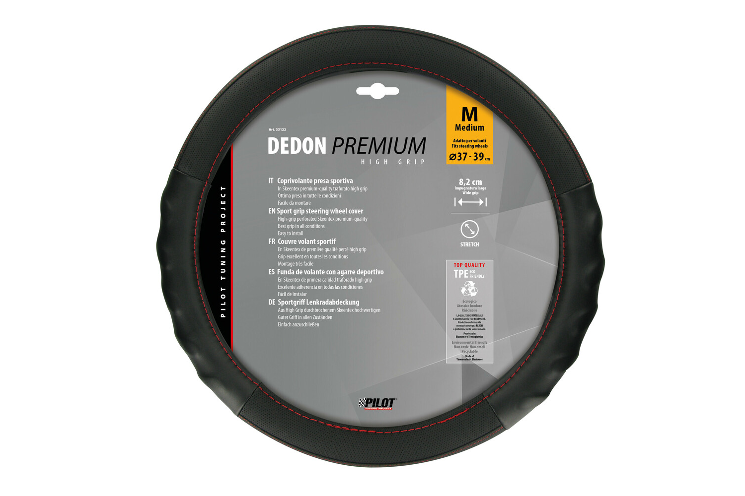 Dedon Premium Skeentex styretrekk i størrelse M (diameter 37–39 cm) er et trekk av høy kvalitet som er utviklet for å forbedre kjørekomfort og sikkerhet. Laget av ultramykt, perforert Skeentex-materiale , gir det utmerket grep under alle forhold, selv på lengre turer. Den ergonomiske formen gir et sikkert grep, reduserer håndtretthet og øker styrekontrollen.