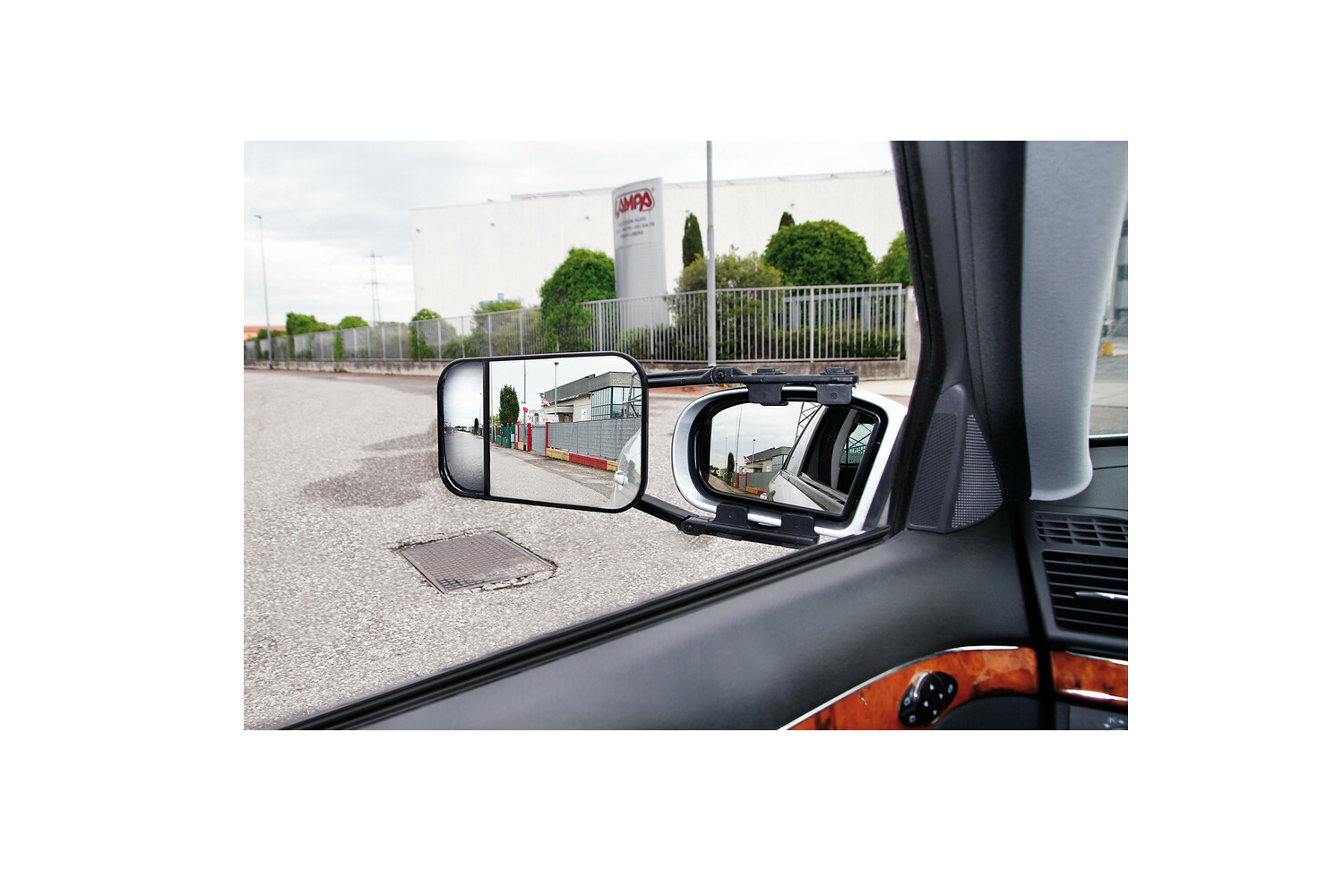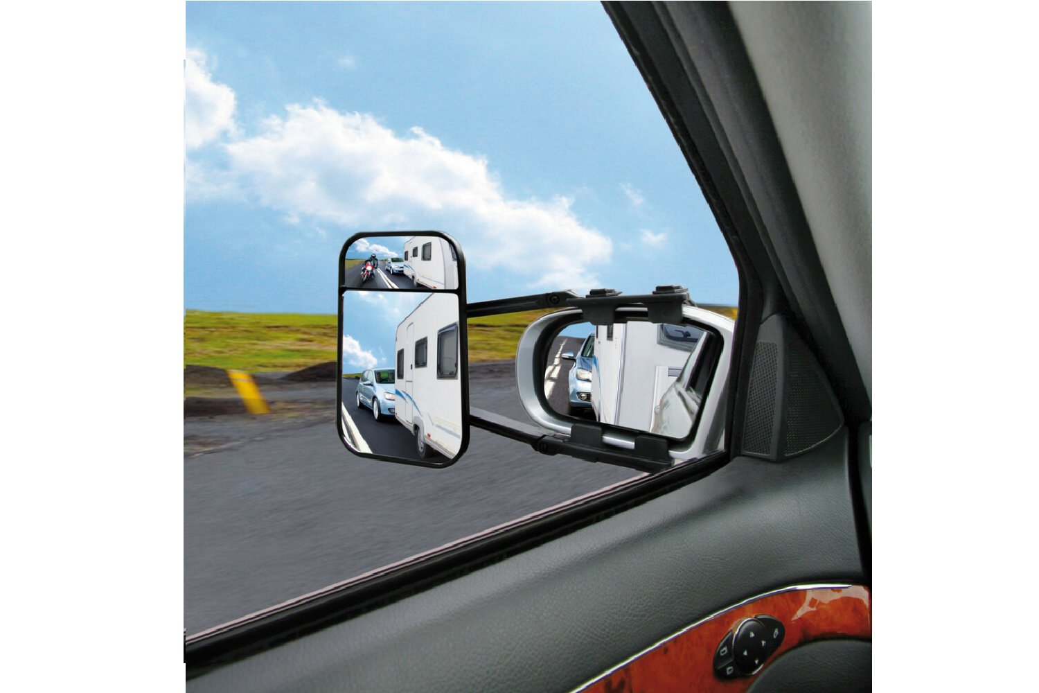 Den flate delen av speilet viser et fullskalabilde, noe som muliggjør presis vurdering av avstand og kjøretøyets hastighet. Den konvekse delen reduserer bildet noe, men utvider synsfeltet betydelig , og avslører blindsoner på siden av speilet. I praksis får du både presisjon (flat) og vidvinkel (konveks), noe som gjør det enklere å bytte fil, forbikjøre, rygge og parkere med campingvogn, båt eller tilhenger. Det er et praktisk tillegg for ferieturer og daglig tauing – montering/fjerning tar bare et øyeblikk, og justeringer lar deg raskt justere sikten til forholdene.