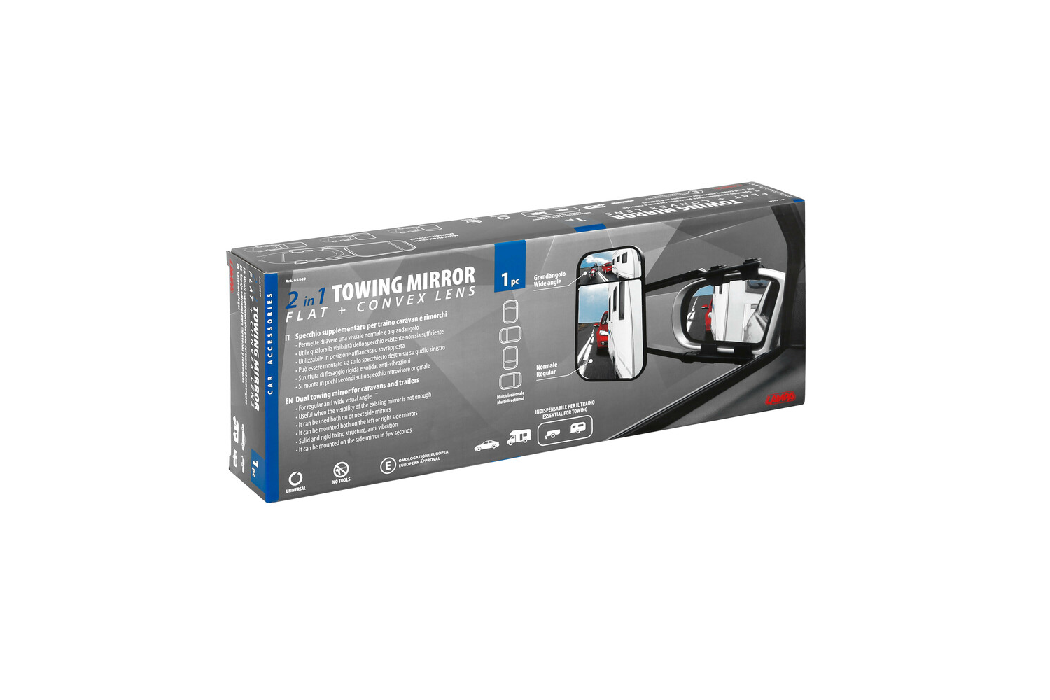 Det flate og konvekse tauespeilet er et universelt tilbehørsspeil som monteres på det originale sidespeilet . Designet med doble linser utvider synsfeltet, og full justering gir ideell synsvinkel. Klemmefestet passer til de fleste speil; stigestropper holder dem sikkert på plass og reduserer vibrasjoner under kjøring. Speilet er universelt, slik at det kan monteres på venstre eller høyre side av kjøretøyet. Produktet er ECE R46-godkjent .