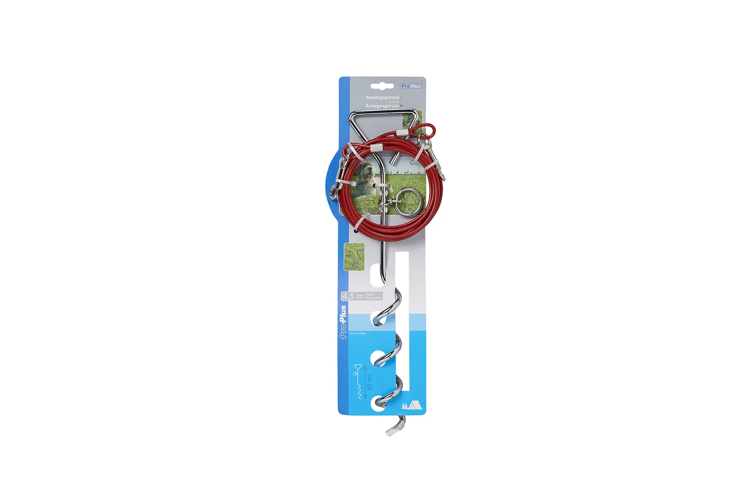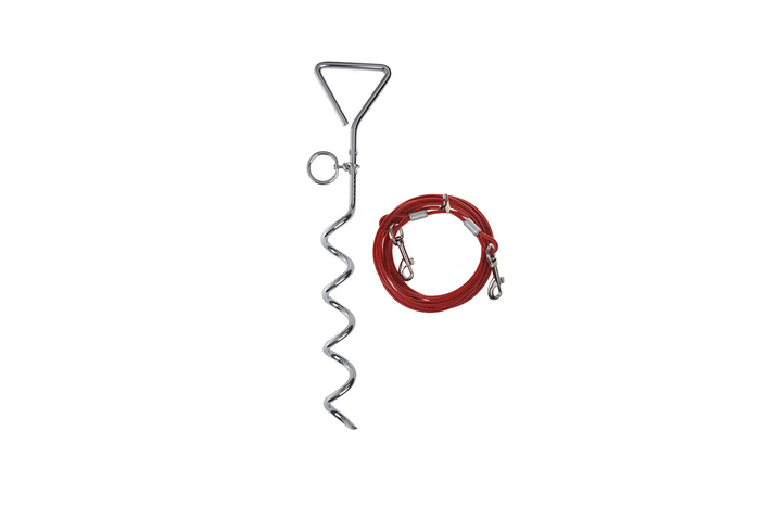 Settet inkluderer en spiralformet jordspyd og en 4,5 meter lang stålkabel . Spydet er laget av slitesterkt stål, og takket være spiralformen kan det festes godt i bakken uten behov for spesialverktøy. Den øvre svingringen bidrar til å forhindre at kabelen floker seg når hunden beveger seg.