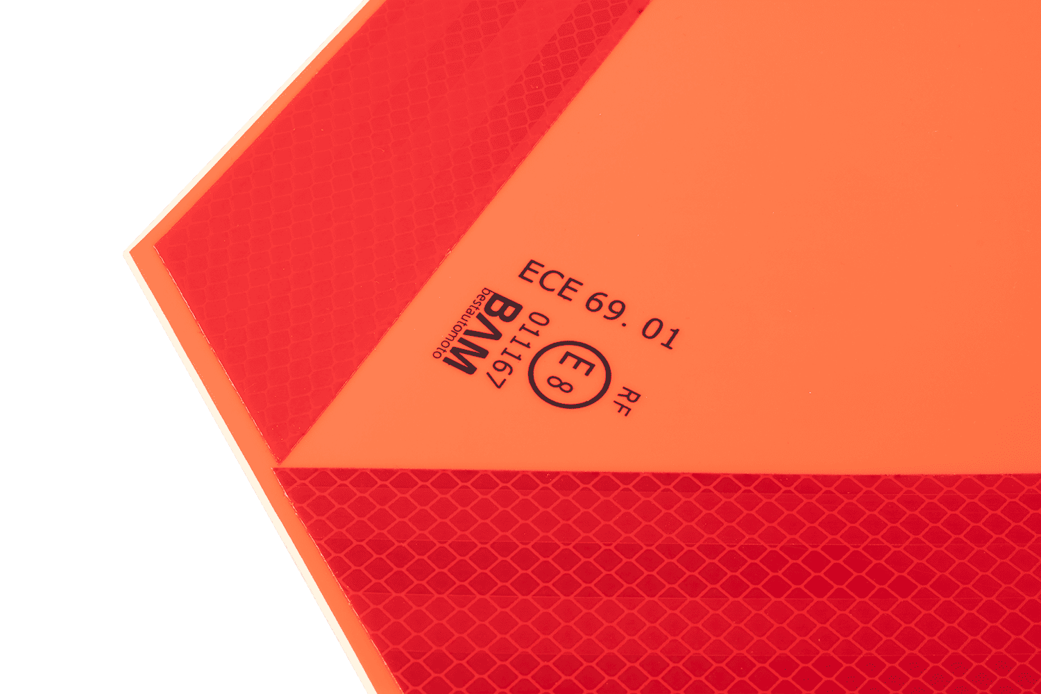 Med dimensjoner på 300 mm på de lengre hjørnene og 120 mm på de kortere hjørnene gir trekanten utmerket sikt, og signaliserer effektivt tilstedeværelsen av et saktegående kjøretøy på veien. Laget av materialer av høy kvalitet, oppfyller den kravene til EU- og E-8-godkjenninger , som garanterer samsvar med gjeldende sikkerhetsstandarder.