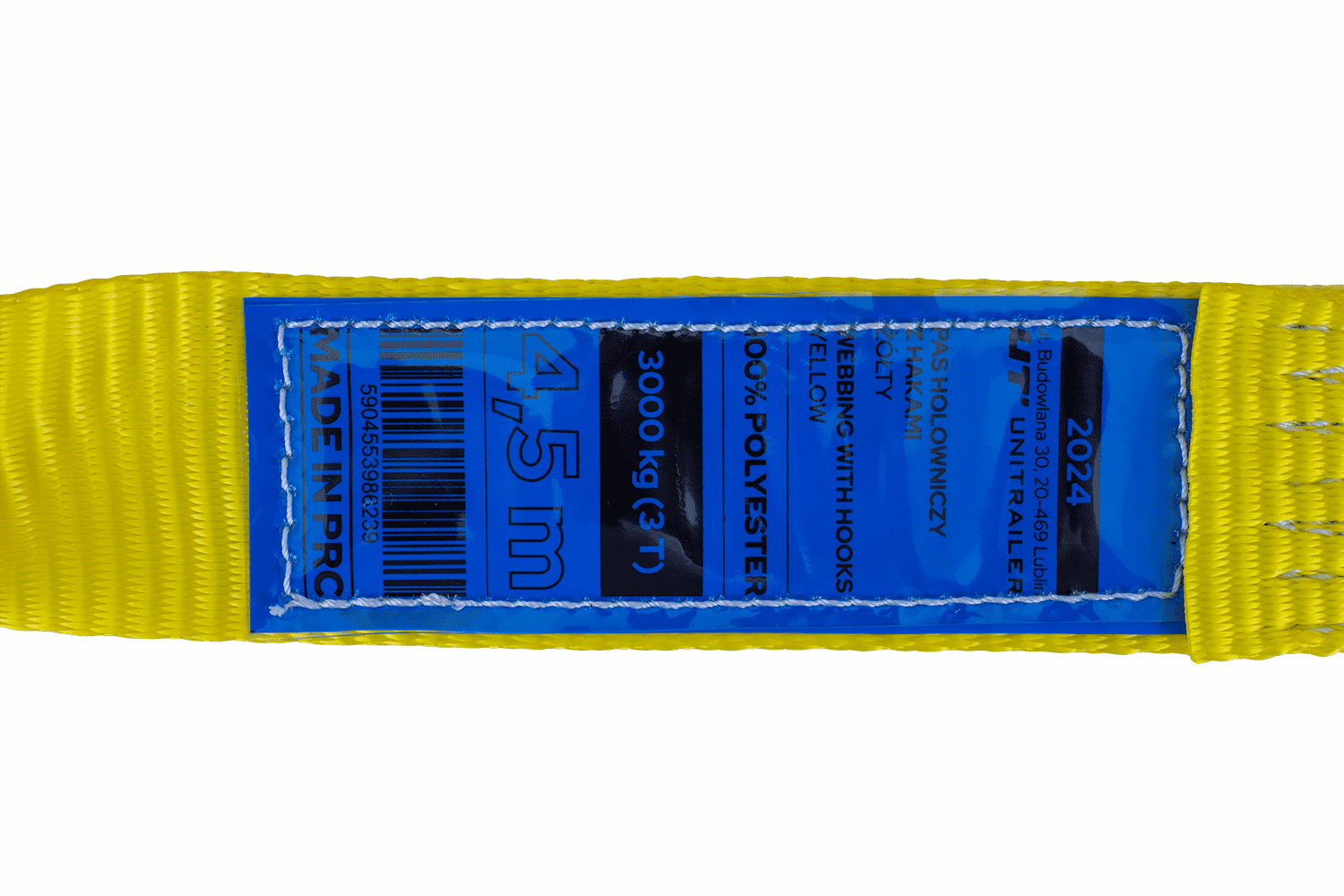 UNITRAILER bryr seg om kvaliteten og sikkerheten til produktene sine, og derfor er slepebåndet utstyrt med slitesterke stålkroker beskyttet mot korrosjon. Tydelige markeringer på tapen og en informasjonsetikett på polsk og engelsk forenkler identifiseringen av tekniske parametere. Denne modellen er et praktisk og viktig utstyr for enhver sjåfør, og øker sikkerheten og beredskapen for uventede situasjoner på veien.