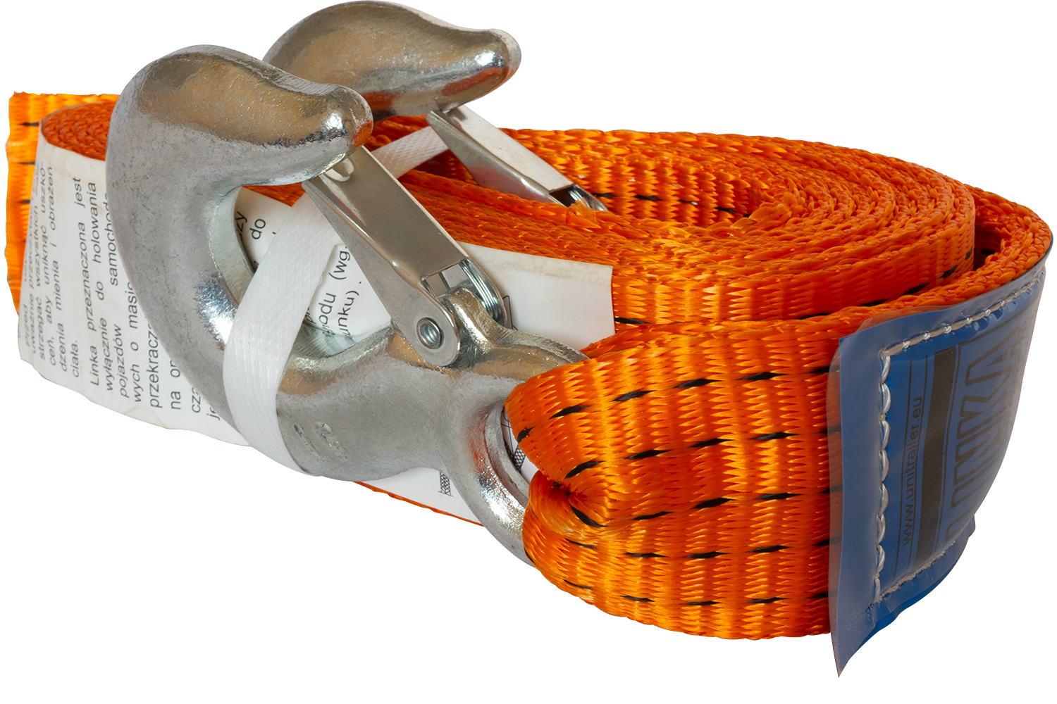 UNITRAILER bryr seg om kvaliteten og sikkerheten til produktene sine, og derfor er slepebåndet utstyrt med slitesterke stålkroker beskyttet mot korrosjon. Tydelige markeringer på tapen og en informasjonsetikett på polsk og engelsk forenkler identifiseringen av tekniske parametere. Denne modellen er et praktisk og viktig utstyr for enhver sjåfør, og øker sikkerheten og beredskapen for uventede situasjoner på veien.
