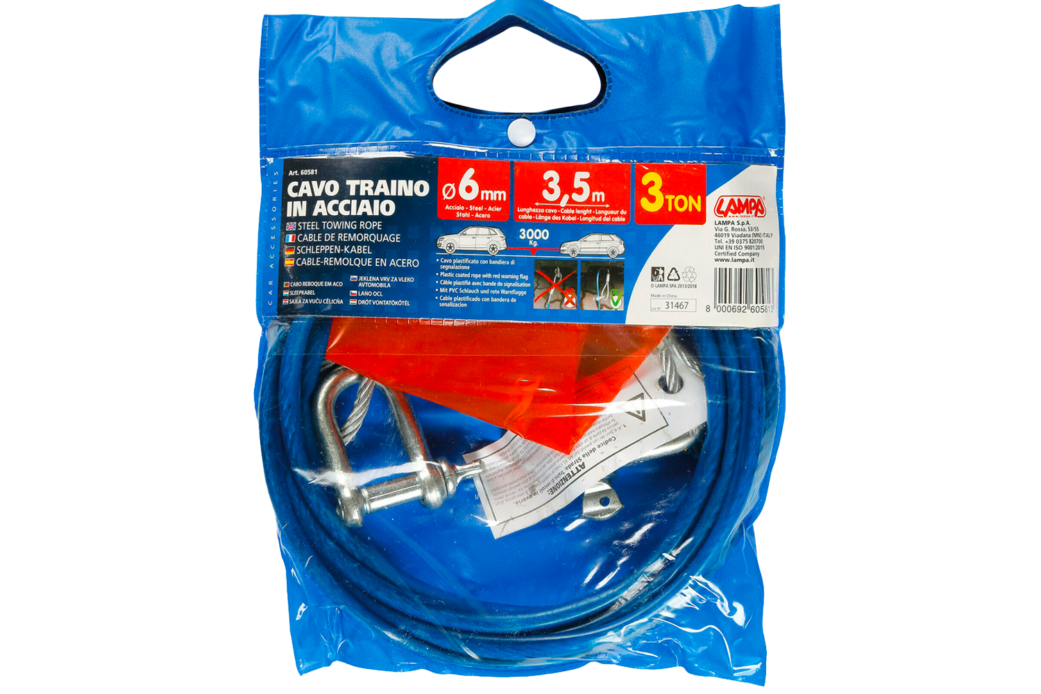 Slepetau med sjakler Den 3,5 meter lange LAMP-en er et pålitelig tilbehør designet for nødtauing av personbiler, varebiler og lette maskiner. Laget av slitesterkt 6 mm tykt ståltau , belagt med plast, gir ekstra beskyttelse mot korrosjon, slitasje og mekanisk skade. I begge ender er kabelen avsluttet med sterke stålsjakler , som garanterer et sikkert og stabilt feste til kjøretøyets slepeøyer. Maksimal trekkraft er 3 tonn (3000 kg) , noe som muliggjør effektiv og sikker tauing under ulike vei- og terrengforhold.