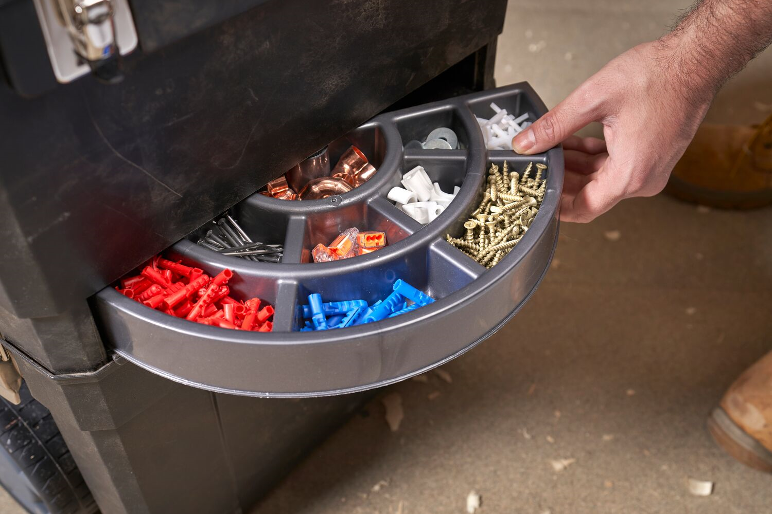 Den øvre delen av verkstedet er utformet som en organisator med et gjennomsiktig deksel , som lar deg raskt finne de mest brukte skruene, boltene, pluggene og andre små gjenstander uten å måtte åpne hele konstruksjonen. Det midterste rommet gir ekstra plass til oppbevaring av håndverktøy , mens det nederste – det romsligste – er ideelt for transport av store apparater som driller, kverner eller vater . Spesielt bemerkelsesverdig er det innovative roterende kammeret som ligger i den nedre delen av verkstedet. Det gir enkel tilgang til de minste elementene, noe som forbedrer arbeidsergonomien betydelig.