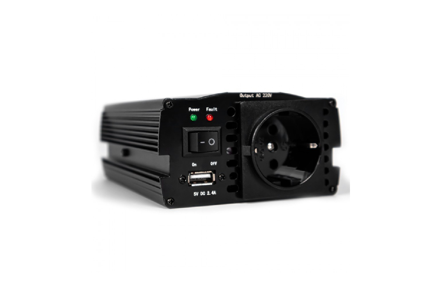 KAMAR 12/230V (300/600W) spenningsomformeren konverterer likestrøm fra et 12V-batteri til 230V vekselstrøm, akkurat som i en stikkontakt. Den lar deg drive 230V-enheter som belysning, ladere og småelektronikk utenfor strømnettet – i et kjøretøy, campingvogn eller båt. Den tilbyr 300W kontinuerlig effekt og 600W toppeffekt, mens en fulllasteffektivitet på ≥85% reduserer energitapet. Omformeren har en innebygd sigarettennerplugg, og batteriklemmer er inkludert.Enheten kan kobles til på to måter: via sigarettennerpluggen (for rask og enkel strømforsyning av mindre apparater) eller direkte til batteriet ved hjelp av klemmene – anbefalt når du vil utnytte hele 300 W-effekten. Omformeren er kun konstruert for batteristrøm; ikke koble likerettere, solcelleregulatorer eller solcellepaneler til inngangen. Velg apparater for kontinuerlig strøm, ta hensyn til innkoblingsstrømmer og sørg for tilstrekkelig ventilasjon av enheten.