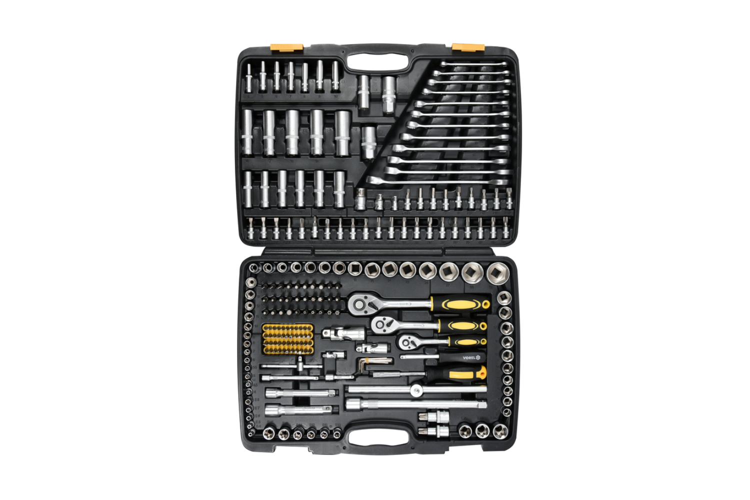 VOREL 58700 1/2" verktøysett er et komplett, profesjonelt verktøysett, ideelt for montering, service og hjemmebruk. Det inneholder 216 presist utformede komponenter som er perfekte for både gjør-det-selv-entusiaster og mekanikere. Verktøyene er pakket i et slitesterkt, ergonomisk plastetui for enkel transport og organisering.