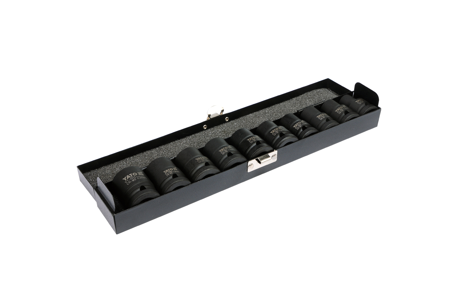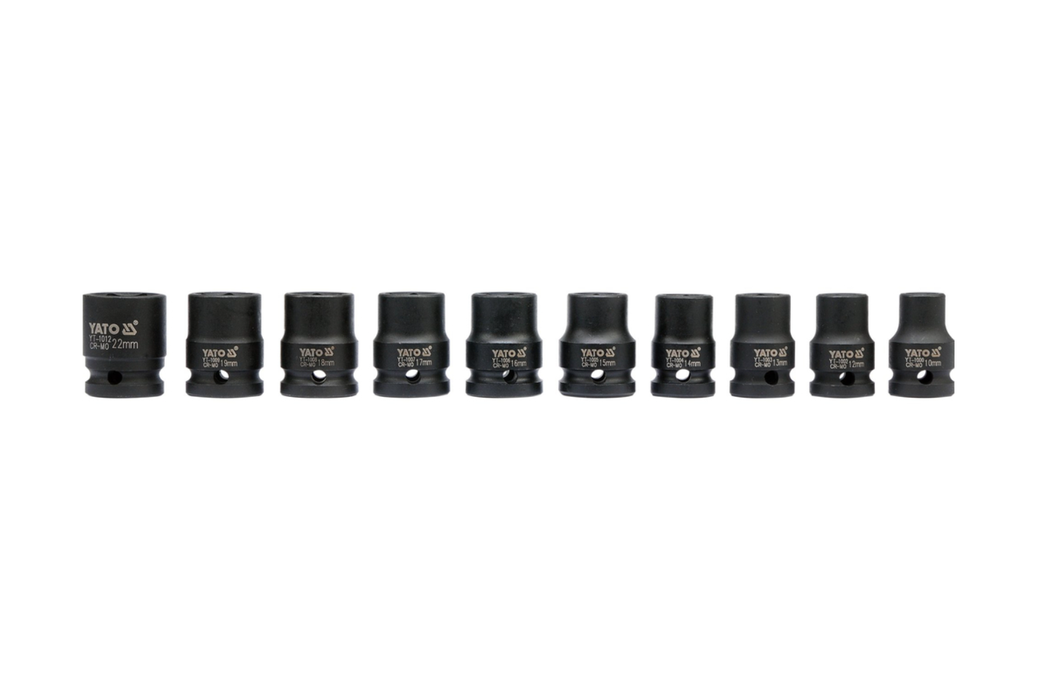 YT-1025 slagpipenøkkelsettet fra YATO er et robust sett med 10 korte 1/2" sekskantpiper , designet for bruk med slagnøkler og skraller. Laget av slitesterkt SCM-440 CrMo-stål og belagt med et fosfatbelegg, er de svært motstandsdyktige mot belastninger og slitasje. AS-DRIVE -systemet forbedrer momentoverføringen og beskytter skruekantene mot skader.