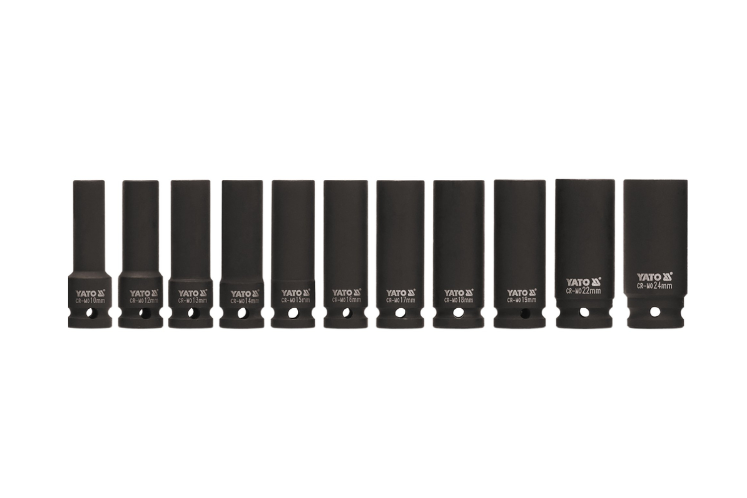 YT-1054 lange slagpipessett fra YATO inkluderer 11 slitesterke 1/2" piper laget av ekstremt belastningsbestandig CrMo SCM-440 stål. Disse lange pipene, omtrent 78 mm høye , er ideelle for vanskelig tilgjengelige steder. Den sekskantede profilen og AS-DRIVE -systemet sikrer pålitelig momentoverføring uten risiko for å skade muttere, mens den utvidede designen letter arbeid på vanskelig tilgjengelige steder.