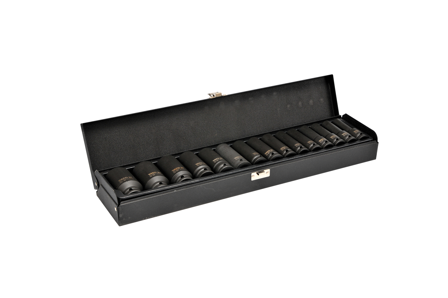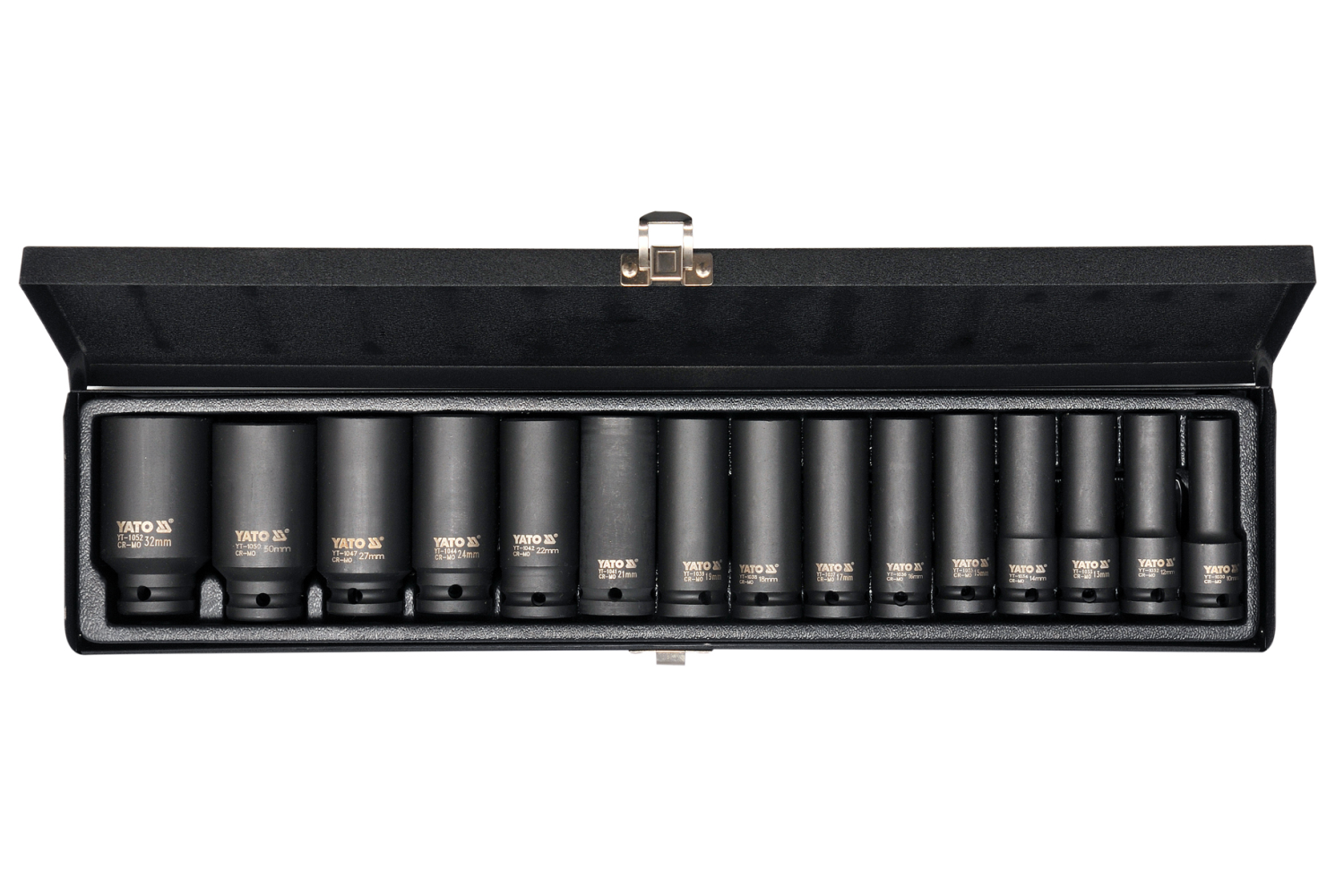 YT-1055 lange slagpipessett fra YATO inkluderer 15 slitesterke 1/2" piper laget av ekstremt belastningsbestandig SCM-440 CrMo-stål. Disse lange pipene, omtrent 78 mm høye , er ideelle for vanskelig tilgjengelige steder. Den sekskantede profilen og AS-DRIVE -systemet sikrer pålitelig momentoverføring uten risiko for å skade muttere, mens den utvidede designen letter arbeid på vanskelig tilgjengelige steder.