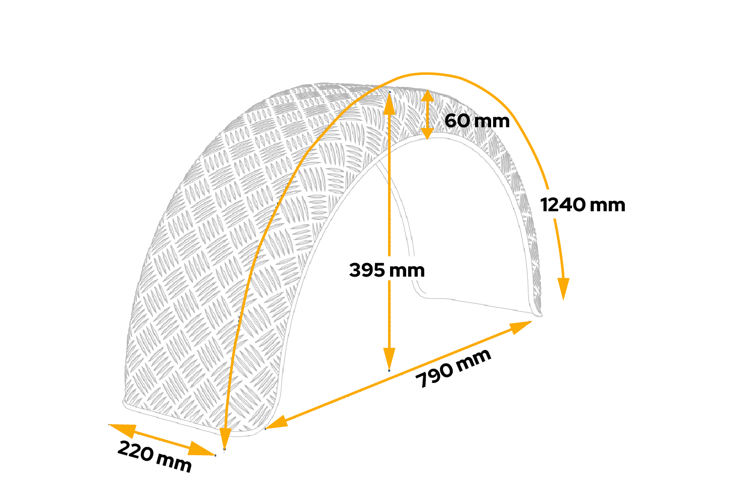 • Enkeltskjerm i aluminium D29130 DOMAR designet for 15 og 16 tommers hjul, har en lengde på 790 mm og en bredde på 220 mm. Den beskytter tilhengeren og lasten mot mekanisk skade og andre trafikanter mot sølesprut eller steiner under hjulene.