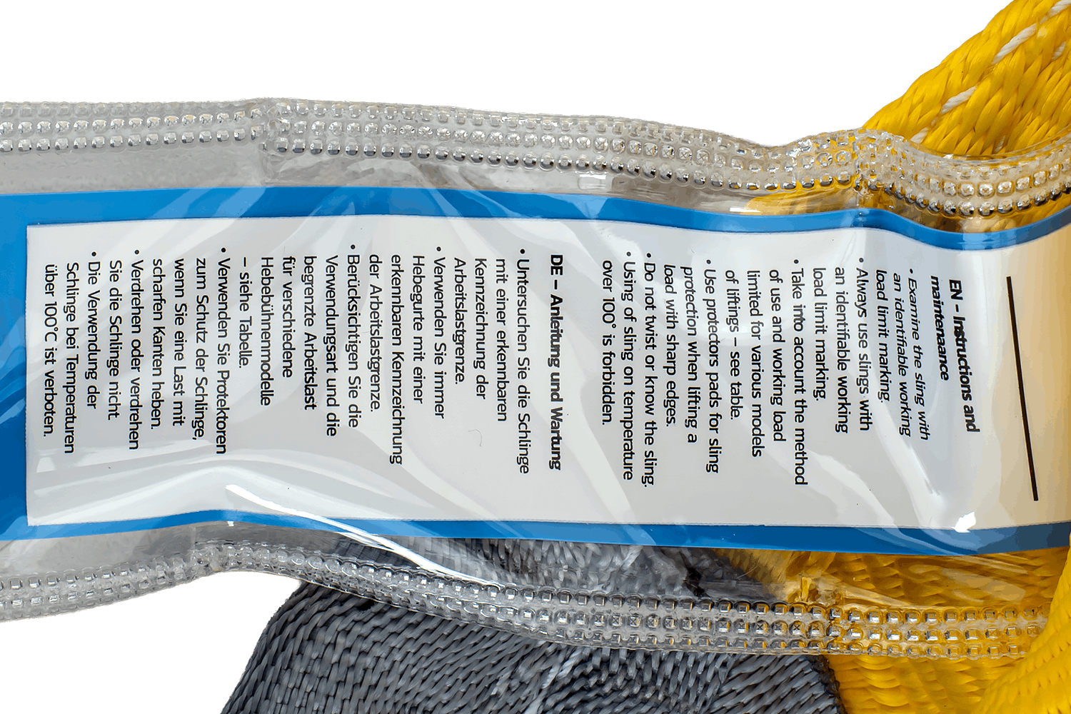 Produktet oppfyller også kravene i den europeiske standarden EN 1492-1 , som regulerer kvaliteten og sikkerheten til slynger laget av syntetiske materialer. En sikkerhetsfaktor på 7:1 betyr at slyngen er konstruert for å tåle en belastning syv ganger den maksimale arbeidsbelastningen, noe som sikrer et høyt nivå av arbeidssikkerhet.