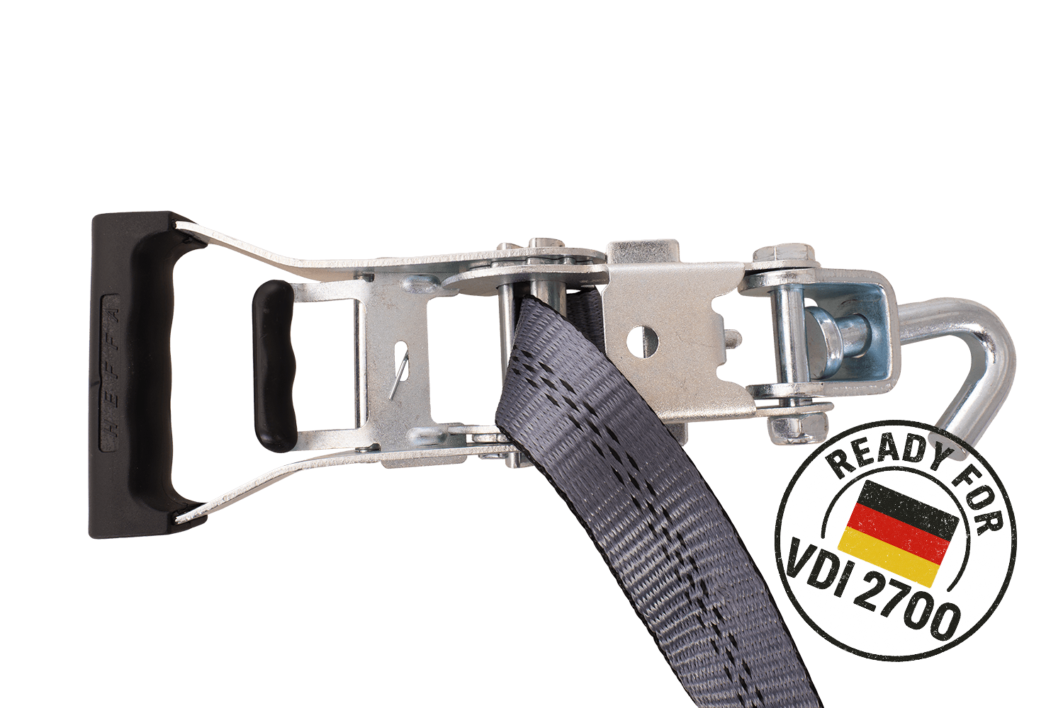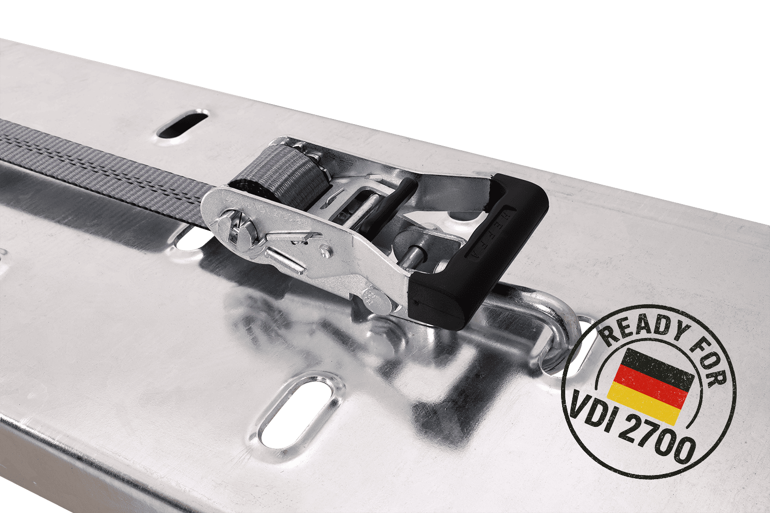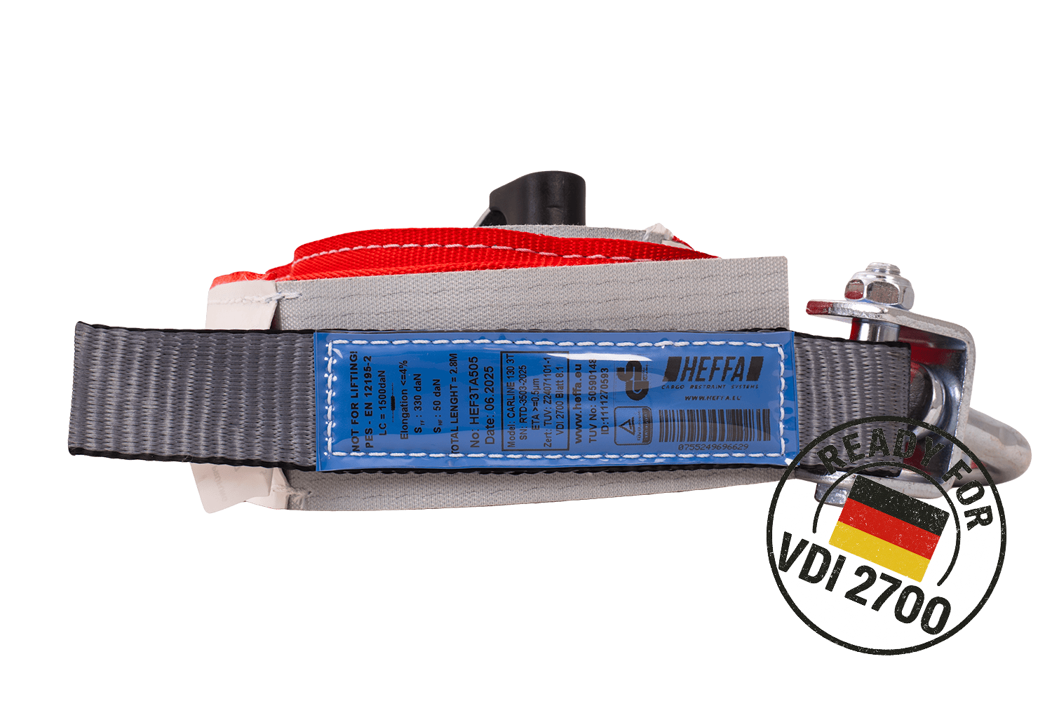 Direktivet VDI 2700 del 8.1 er en tysk teknisk standard som spesifiserer detaljerte krav for sikring av kjøretøy som transporteres på tilhengere med lasteplan og trailere . Når det gjelder surrestropper med hjulstropping, spesifiserer dette direktivet blant annet metoden for belteplassering, det nødvendige antallet surrepunkter (f.eks. 3-punktssystem), minimumsspenningsparametere og prinsippene for merking og tekniske godkjenninger. Samsvar med VDI 2700 8.1 betyr at stroppene oppfyller strenge krav til sikkerhet, pålitelighet og effektivitet ved immobilisering av det transporterte kjøretøyet , noe som er avgjørende for profesjonell transport av personbiler og varebiler. Takket være dette kan brukeren være sikker på at det brukte surresystemet oppfyller gjeldende europeiske og tyske standarder innen trafikksikkerhet.