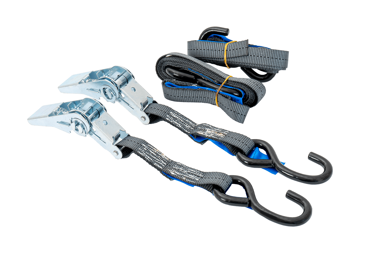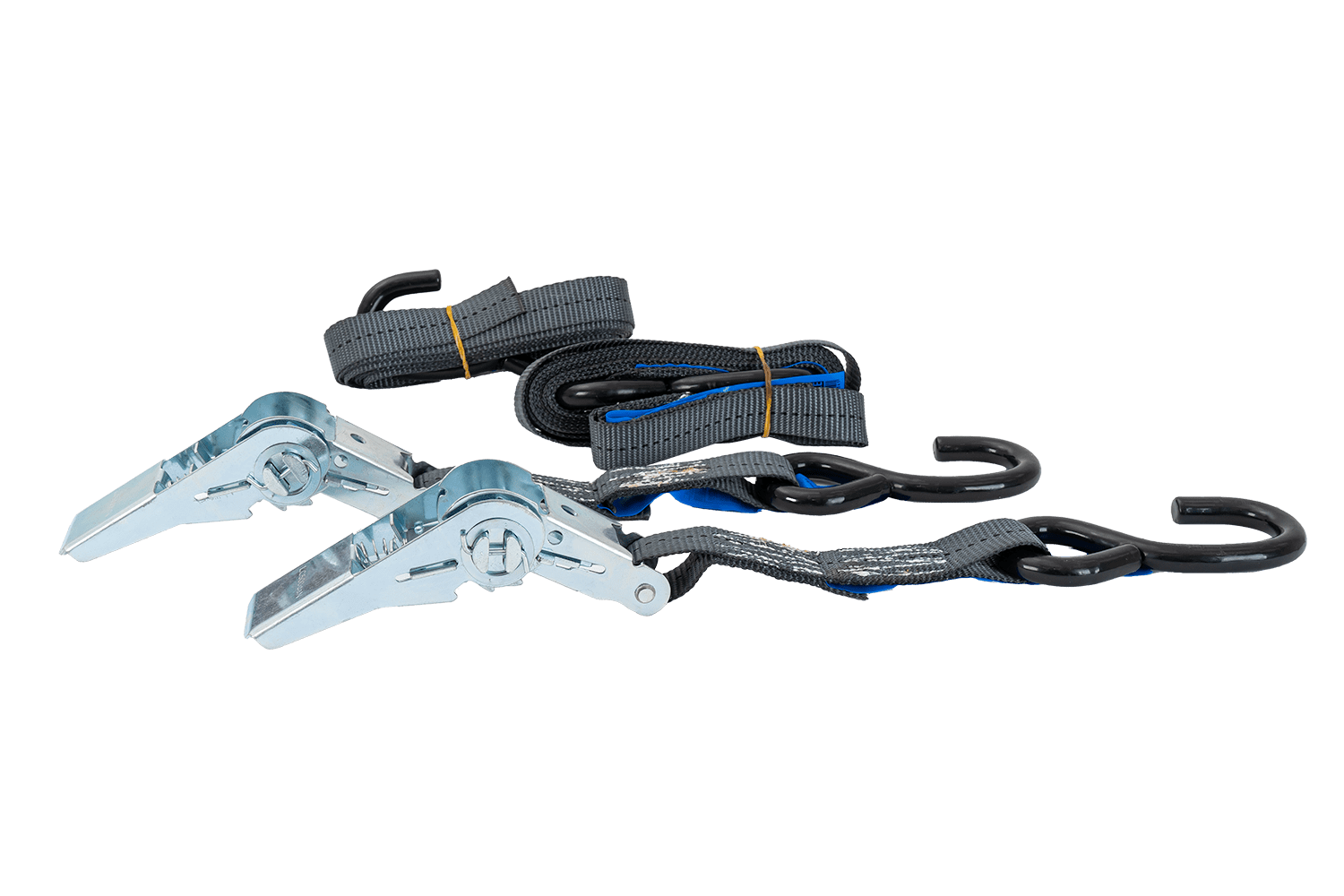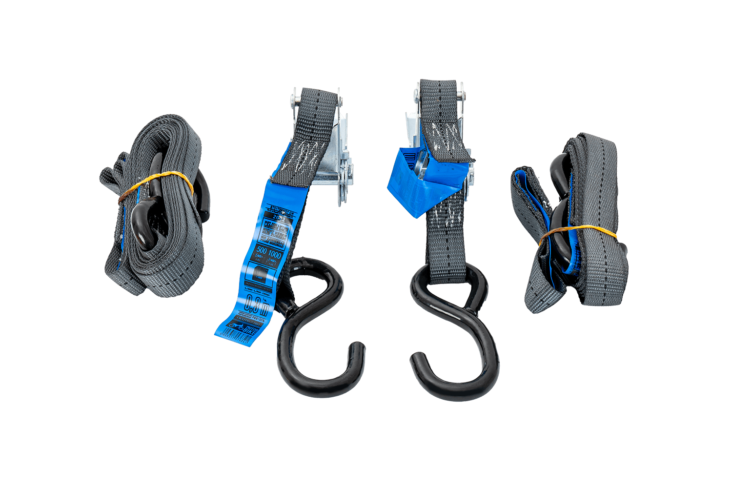 Sett med to HILLS 3m/25mm/1t transportbelter med strammer og to 0,45m seler for sikring av motorsykkelen