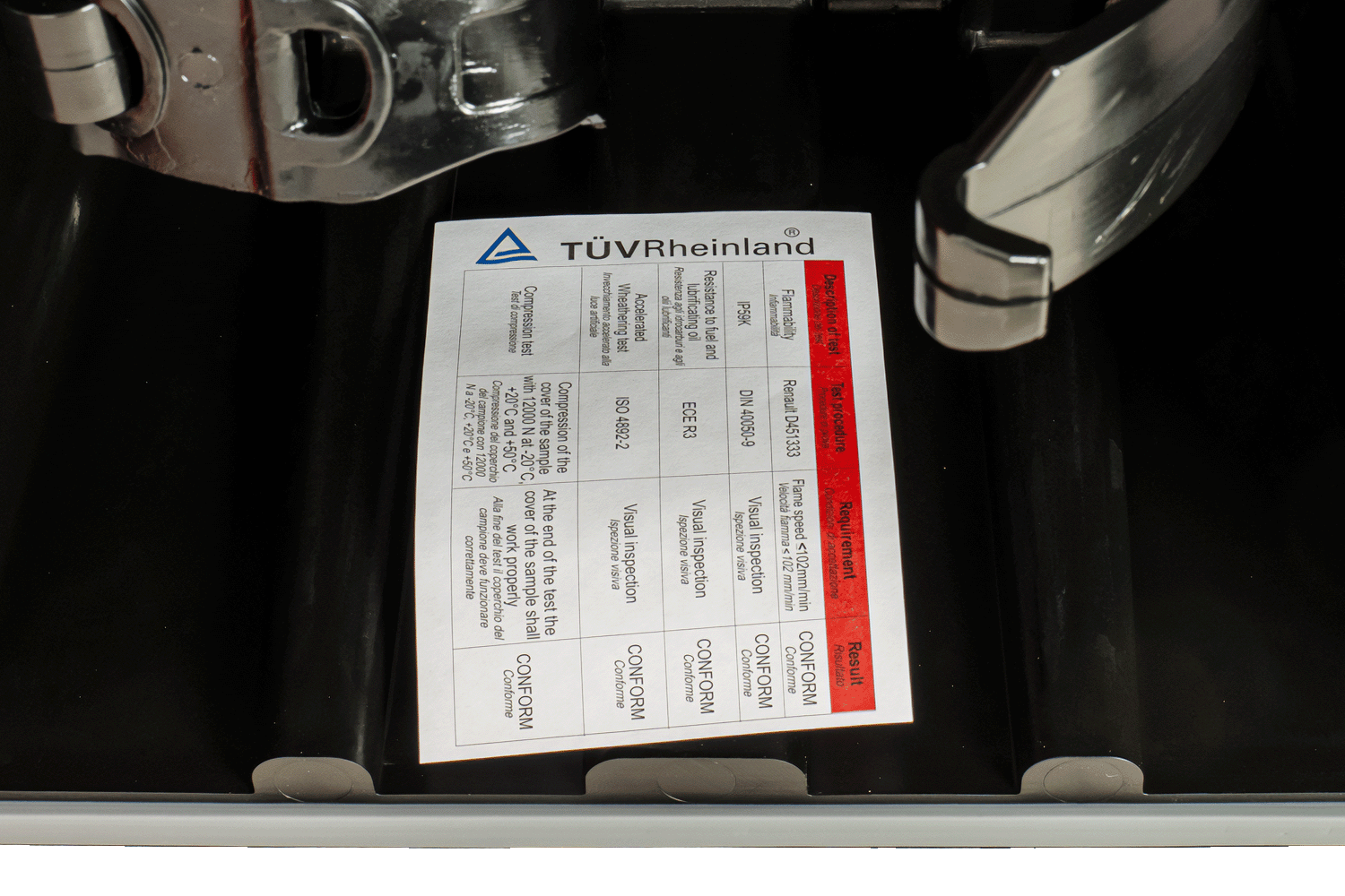 Brannslukningsboksen er VCA-godkjent som et sidebeskyttelsessystem , E11 73 R - 011168-sertifikat og laboratorietester TÜV Rheinland . VCA-homologering bekrefter at produktet kan brukes som et beskyttende element på siden av kjøretøyet, og oppfyller strenge sikkerhetskrav for beskyttelse av andre trafikanter. Disse sertifikatene er et bevis på produktets høye kvalitet og at det overholder internasjonale sikkerhetsstandarder innen veitransport .