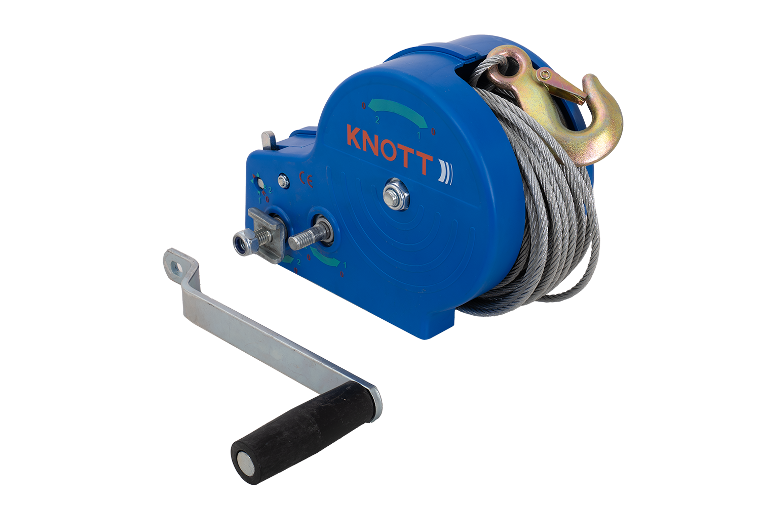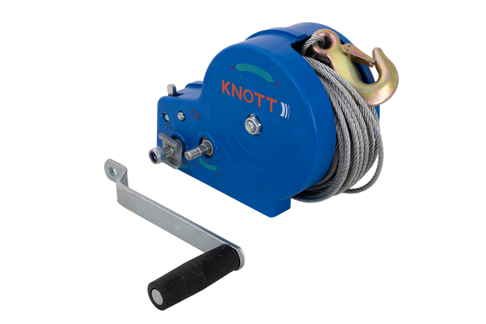 Knott manuelle sveivvinsj, med en maksimal horisontal trekkraft på 1135 kg, er primært designet for båthengere og flatbedhengere. Vinsjen har et hus, et påskrubart sveivhåndtak og en omtrent 7 meter lang kabel avsluttet med en solid krok. Enheten har to girforhold.