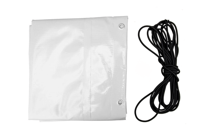 Presenningen er laget av tykt, vanntett materiale med en vekt på 500 g/m2, og selv langvarig nedbør vil ikke føre til lekkasje. Den grå fargen på presenningen gjør at den matcher utseendet til enhver bilhenger og ser bra ut. Presenningssettet inkluderer også en elastisk snor .