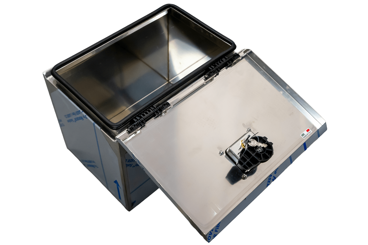 Kassen er laget av polert rustfritt stål , som er usedvanlig slitesterkt, estetisk tiltalende og korrosjonsbestandig. Den har en NextT-lås i rustfritt stål som sikrer sikker lukking og forbedret beskyttelse av innholdet. Kassens konstruksjon er vibrasjons- og støtsikker , noe som gjør den ideell for intensiv bruk under krevende forhold. Kassens lokk er utstyrt med en tetning som sikrer fullstendig tetthet og forhindrer at vann og støv kommer inn i kassen . Denne designen beskytter effektivt oppbevart verktøy og utstyr mot skadelige ytre faktorer, noe som er spesielt viktig ved intensiv bruk på byggeplasser eller i tøffe værforhold.