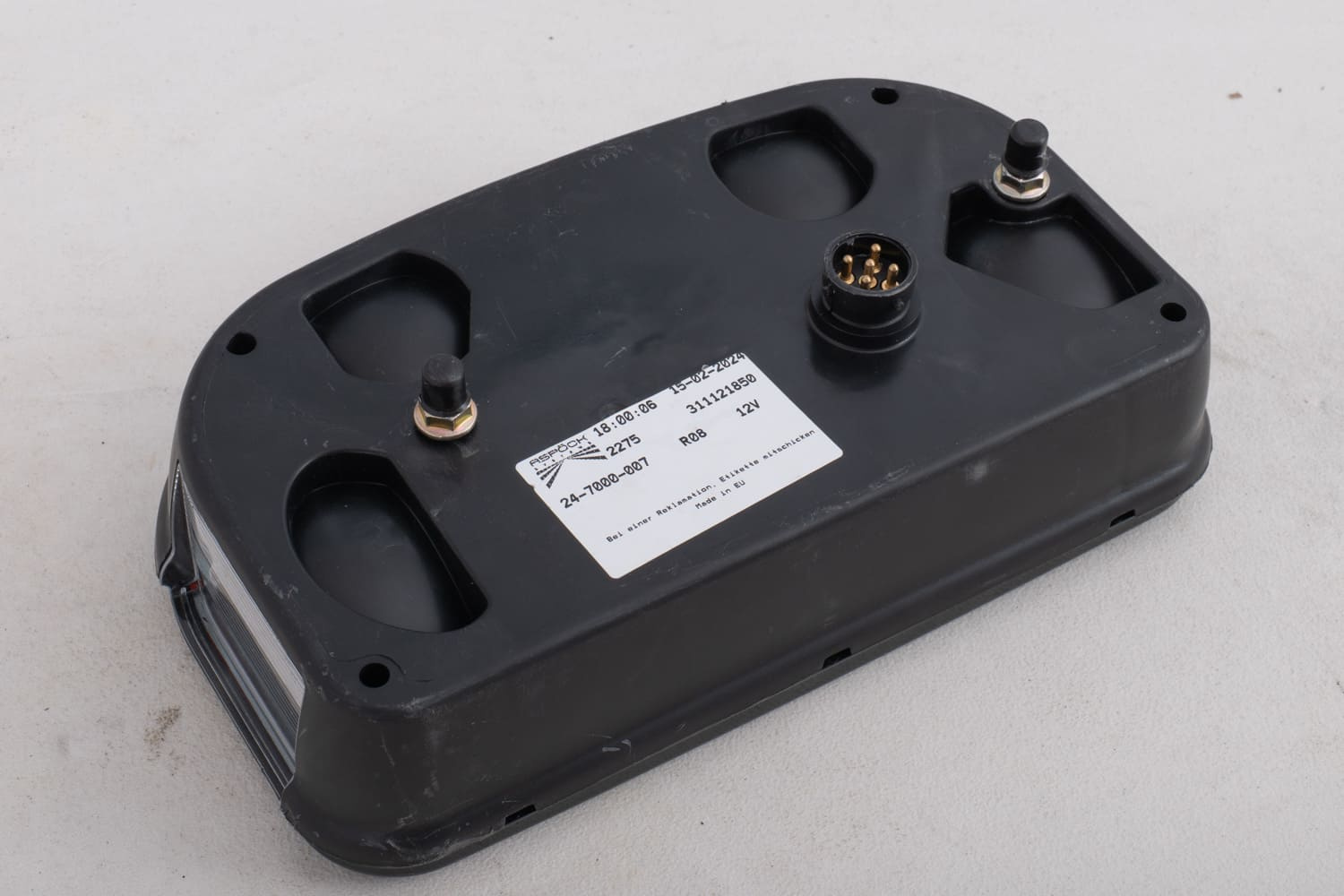 Multipoint II-baklykten fra ASPÖCK er designet for montering på venstre side av kjøretøyet og kjennetegnes av følgende dimensjoner: bredde 240 mm, høyde 140 mm, dybde 52 mm . Utstyrt med en 5-pinners bajonettkontakt , muliggjør den enkel og rask installasjon. i tilhengere, busser eller trailere .