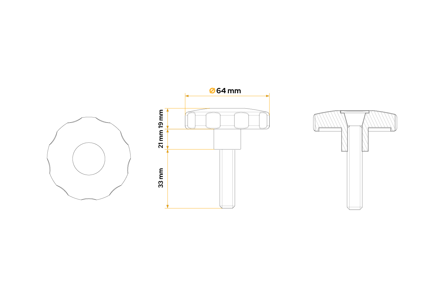 POK-03 M10x33 forsterket stjerneknott (hanntype) er et robust feste for sikring av ramper under transport uten bruk av verktøy. Den sentrale delen har en M10-skrue med 33 mm gjenger innebygd i plasten, noe som gjør montering og demontering rask og tilkoblingen stabil. Den ergonomiske "stjerneformen" gir et sikkert grep, selv med hansker på, og knottens diameter på 64 mm gir tilstrekkelig trykk for å sikre komponenter under kjøring.