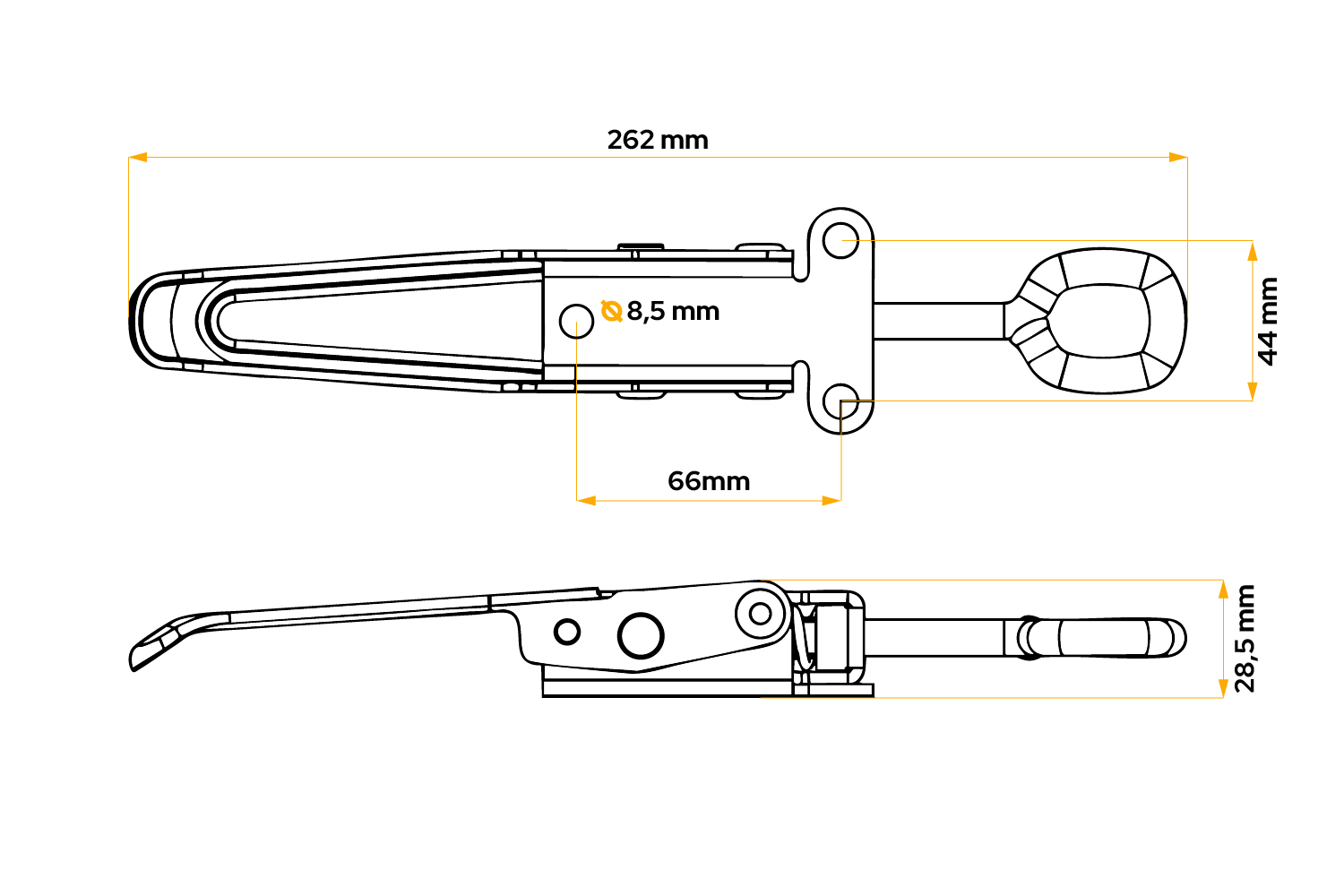 KNOTT 6S5684.001 eksentrisk sidefeste er et robust tilhengerbeslag som er utviklet for å sikre sidene på laste-, landbruks- og nyttehengere sikkert og permanent. Tilhengeren er 262 mm lang og 44 mm bred .