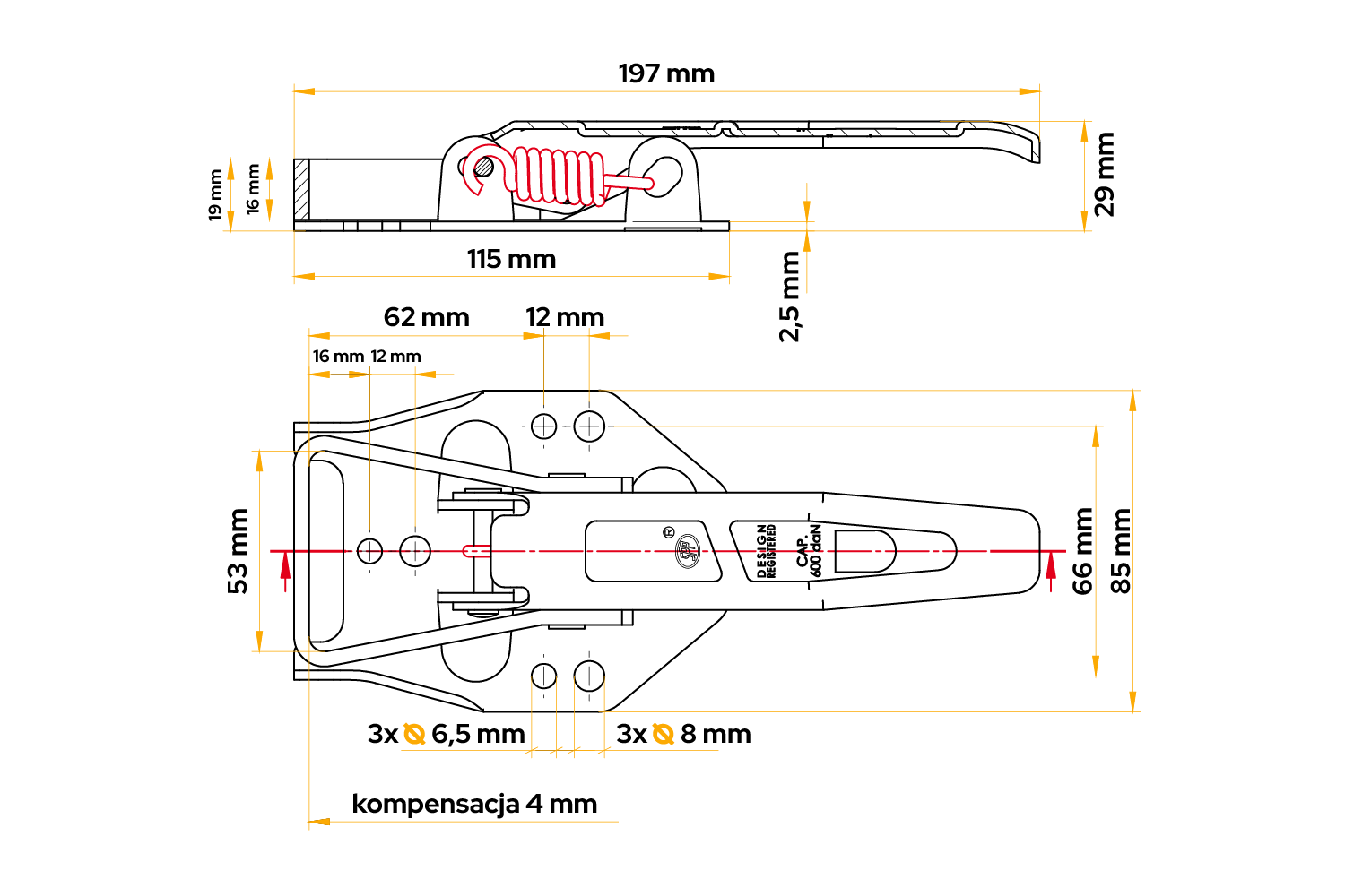 STEELPRESS ZB-04 sidebordfeste er en robust tilhengerkomponent som er designet for å sikre sidene på laste-, landbruks- og nyttekjøretøy sikkert og permanent. Festet er 197 mm langt og har en lastekapasitet på opptil 600 kg , noe som sikrer holdbarhet selv under tung bruk. Festets design tillater opptil 4 mm kompensasjon, noe som gir fleksibel justering til ulike sidebordkonfigurasjoner, noe som sikrer stabil lukking og eliminerer risikoen for spontan åpning under kjøring .