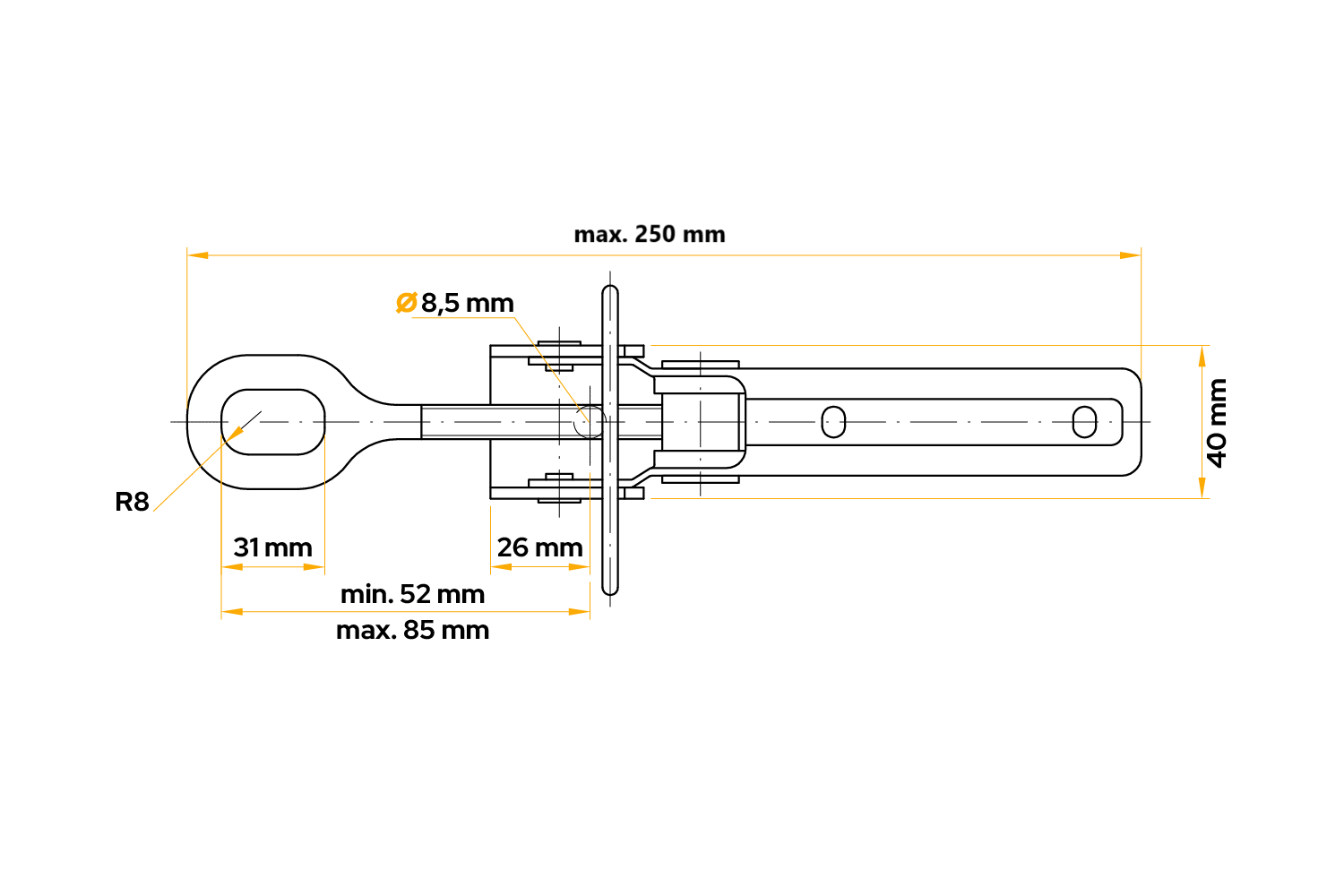 Det eksentriske sidefestet BV 40-1 fra WINTERHOFF er en robust tilhengerkomponent som er utviklet for å sikre sidene på laste-, landbruks- og nyttehengere sikkert og permanent. Festet er 250 mm langt og har en lastekapasitet på opptil 1100 kg , noe som sikrer holdbarhet selv under tung bruk . Festet er utstyrt med en sikkerhetsnål for å forhindre utilsiktet åpning, og en fleksibel plastsnor forhindrer tap, noe som sikrer komfort og sikkerhet.