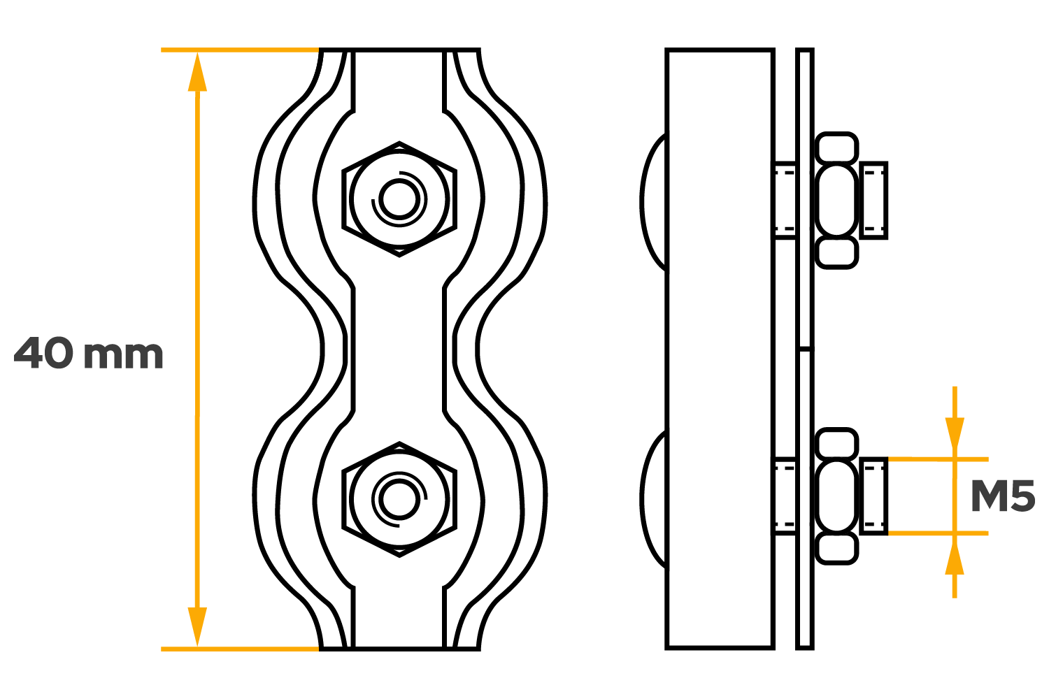 ZLS.4-tauklemmen fra DROMET er en dobbel (serie) sadelklemme designet for tilkobling, festing og klemme av stålkabler med en diameter på 4 mm . Utstyrt med en M5-gjenge og en total lengde på 40 mm , gir den en stabil og jevn feste av tauet i to punkter, noe som øker holdbarheten og sikkerheten til festet. Takket være sadelkonstruksjonen sikrer klemmen rask montering og god passform i systemer som krever en større trykkflate.