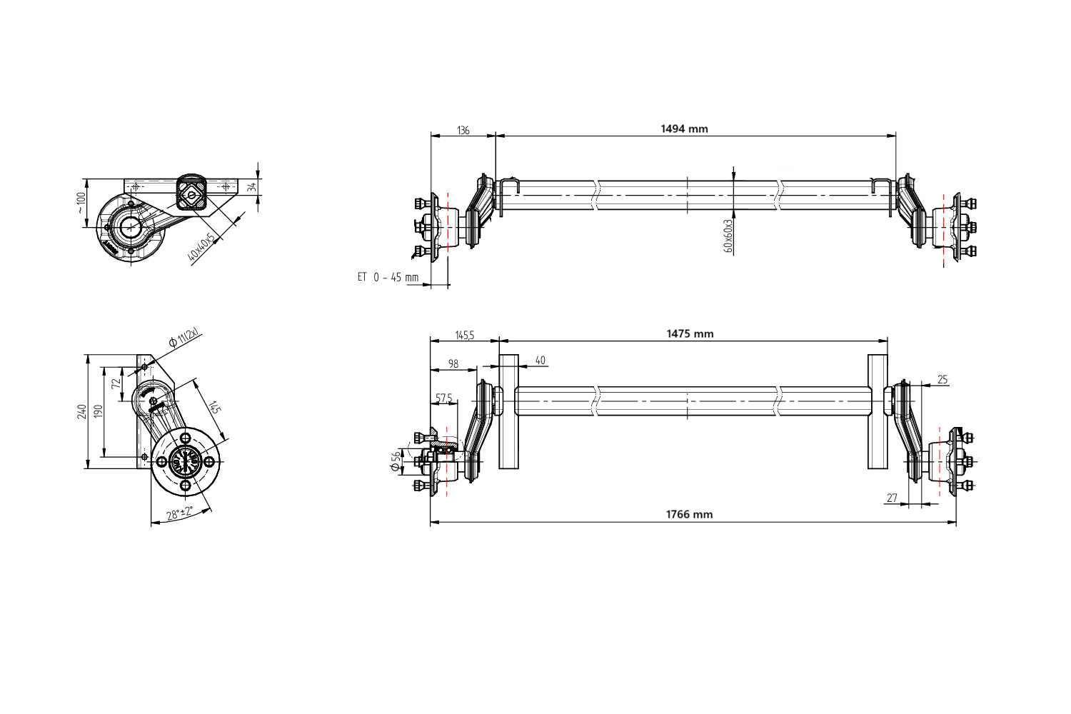 KNOTT 6AB066.001 ubremset aksel er designet for lette tilhengere med en maksimal lastekapasitet på 750 kg . Monteringshullavstanden er 1475 mm og navavstanden er 1766 mm , noe som gir enkel montering på en rekke kjøretøy. Standard 4x100 boltmønster sikrer kompatibilitet med de fleste hjul som er tilgjengelige på markedet. Svingarmens lengde er 145 mm , noe som sikrer stabilitet og optimal støtdemping, og dermed øker kjøresikkerheten, selv med full last. Akslingen er også utstyrt med vanntette lagre , noe som gjør den ideell for båthengere , noe som sikrer holdbarhet og beskyttelse under vannbaserte forhold.