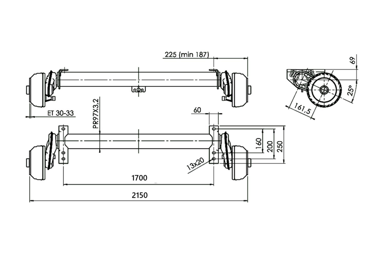 Den bremsede akselen fra AL-KO-produsenten er beregnet for tunge tilhengere eller bergingsbiler med en maksimal lastekapasitet på 1350 kg for en enkelt aksel og 2700 kg for en tandemaksel . Avstanden mellom monteringshullene er 1700 mm, avstanden mellom navene er 2150 mm , noe som muliggjør enkel installasjon i et bredt spekter av kjøretøy. 5x112 boltemønsteret sikrer kompatibilitet med et bredt utvalg hjul tilgjengelig på markedet. Svingarmspakens lengde er 161,5 mm, noe som sikrer stabilitet og optimal støtdemping, og øker dermed kjøresikkerheten, selv når den er fullastet.