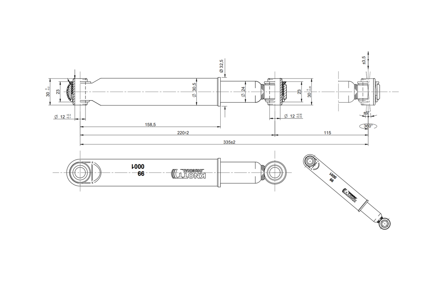 KNOTT 990001 støtdemper er 335 mm lang (strukket) og 220 mm lang (komprimert), målt mellom aksene til monteringshullene. Stempelets ytre diameter er 30 mm og diameteren på monteringshullene er 12 mm . Installasjonen utføres ved hjelp av maljer med hylser, noe som muliggjør rask og sikker festing til tilhengerrammen og akselarmen. Produktet er utviklet for å fungere med alle KNOTT-aksler med bremser, og designet sikrer optimal demping i driftstemperaturområdet fra -30 °C til +80 °C. Den høye kvaliteten på materialene som brukes gjør støtdemperen motstandsdyktig mot korrosjon og mekanisk skade.