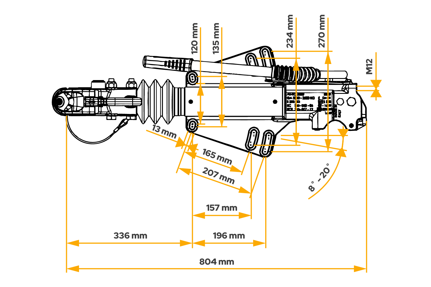 Enheten tilbyr to monteringsalternativer: toppen eller bunnen av dragstangen , noe som gir fleksibilitet ved tilpasning til ulike tilhengerdesign. Vær imidlertid oppmerksom på at maksimal tillatt dragstanghøyde for bunnmontering er 100 mm. Denne monteringsallsidigheten muliggjør optimalisering av vektfordeling, tilpasning til ulike tilhengerdesign og tilpasning til spesifikke brukskrav, noe som sikrer enhetens sikkerhet og effektivitet i en rekke bruksområder.