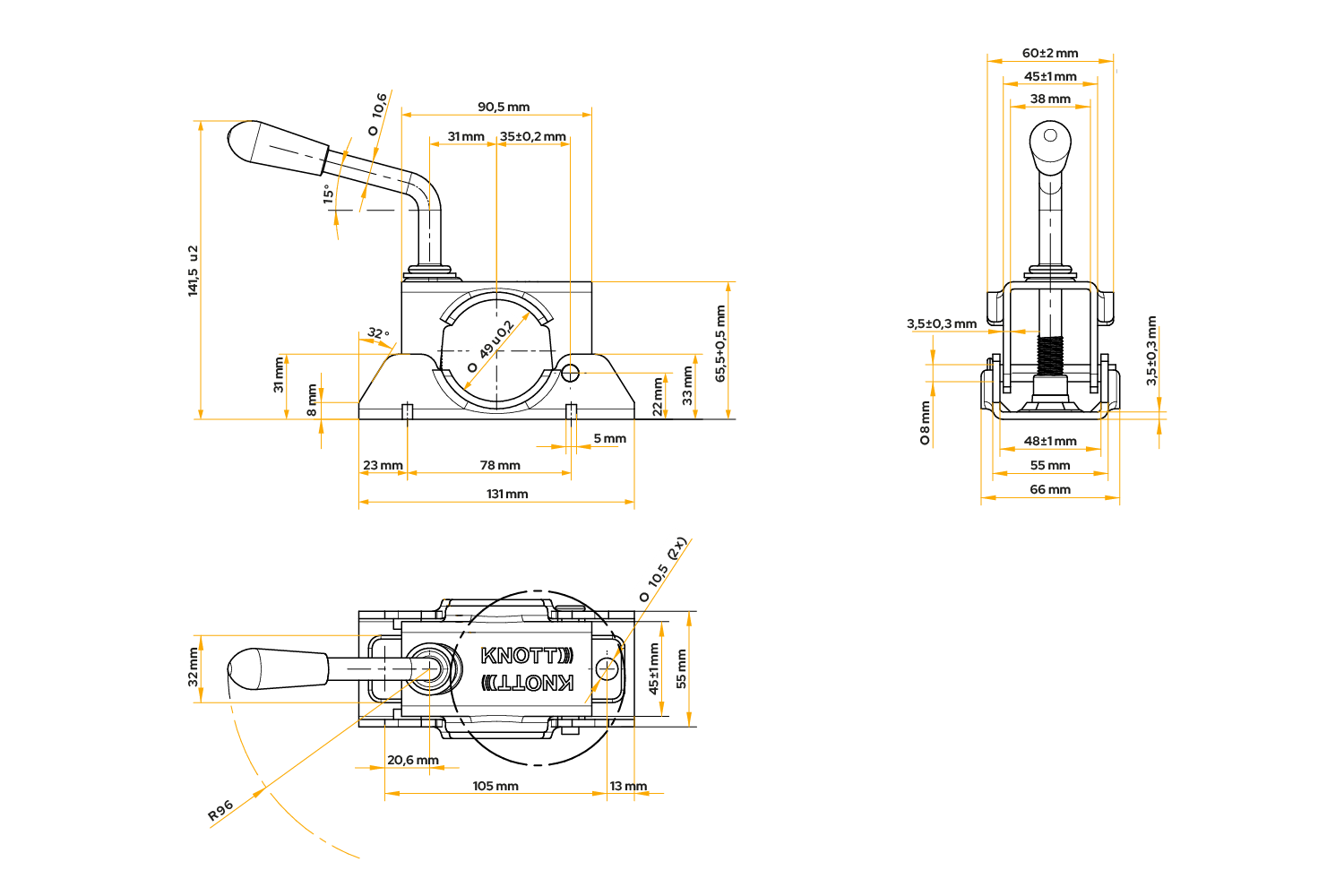 KNOTT LB48-klemmen (tvinge) er designet for montering av et støttehjul eller støtteben med et rør med 48 mm diameter , noe som sikrer en stabil og sikker feste til tilhengerens trekkstang. Klemmen er 131 mm lang og 66 mm bred , noe som sikrer tilstrekkelig klemflate og solid støtte for røret. Den er utstyrt med to monteringshull med 10,5 mm diameter og 105 mm avstand, noe som muliggjør enkel og presis montering på tilhengerens konstruksjon.