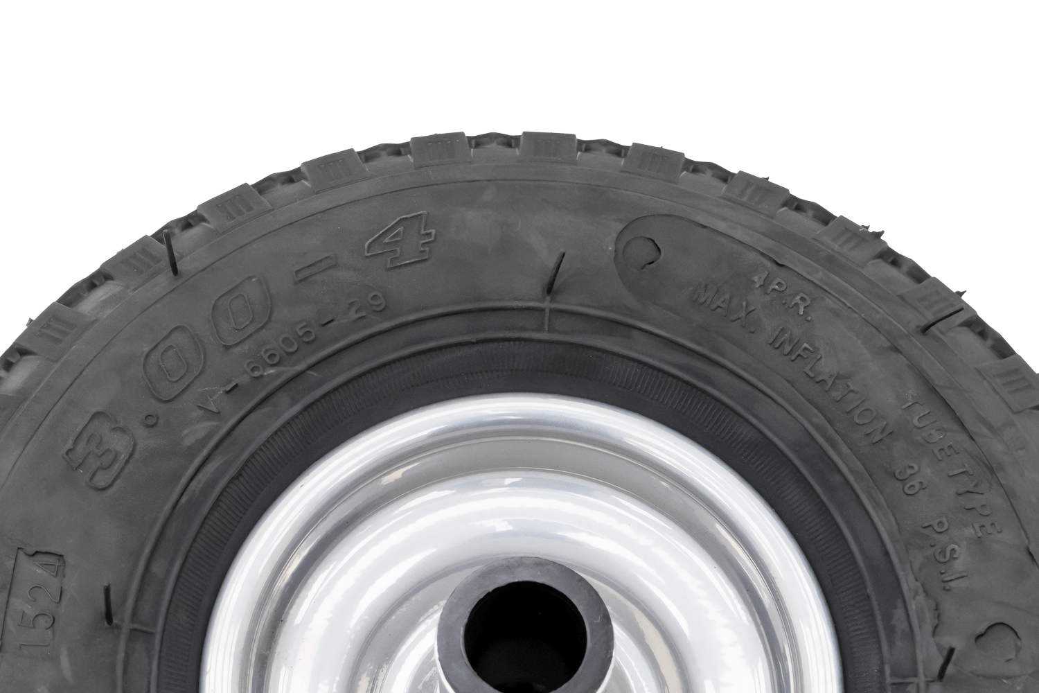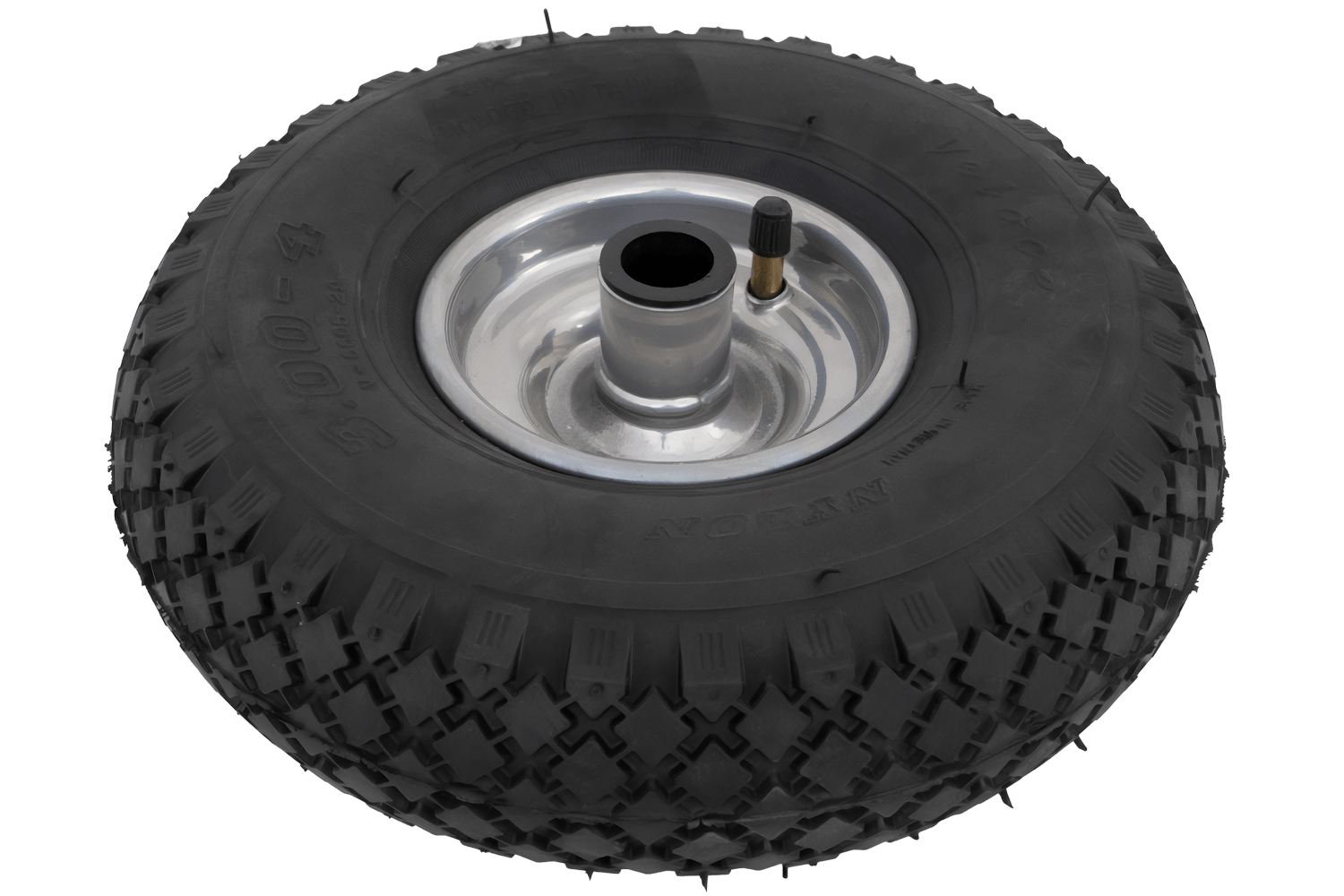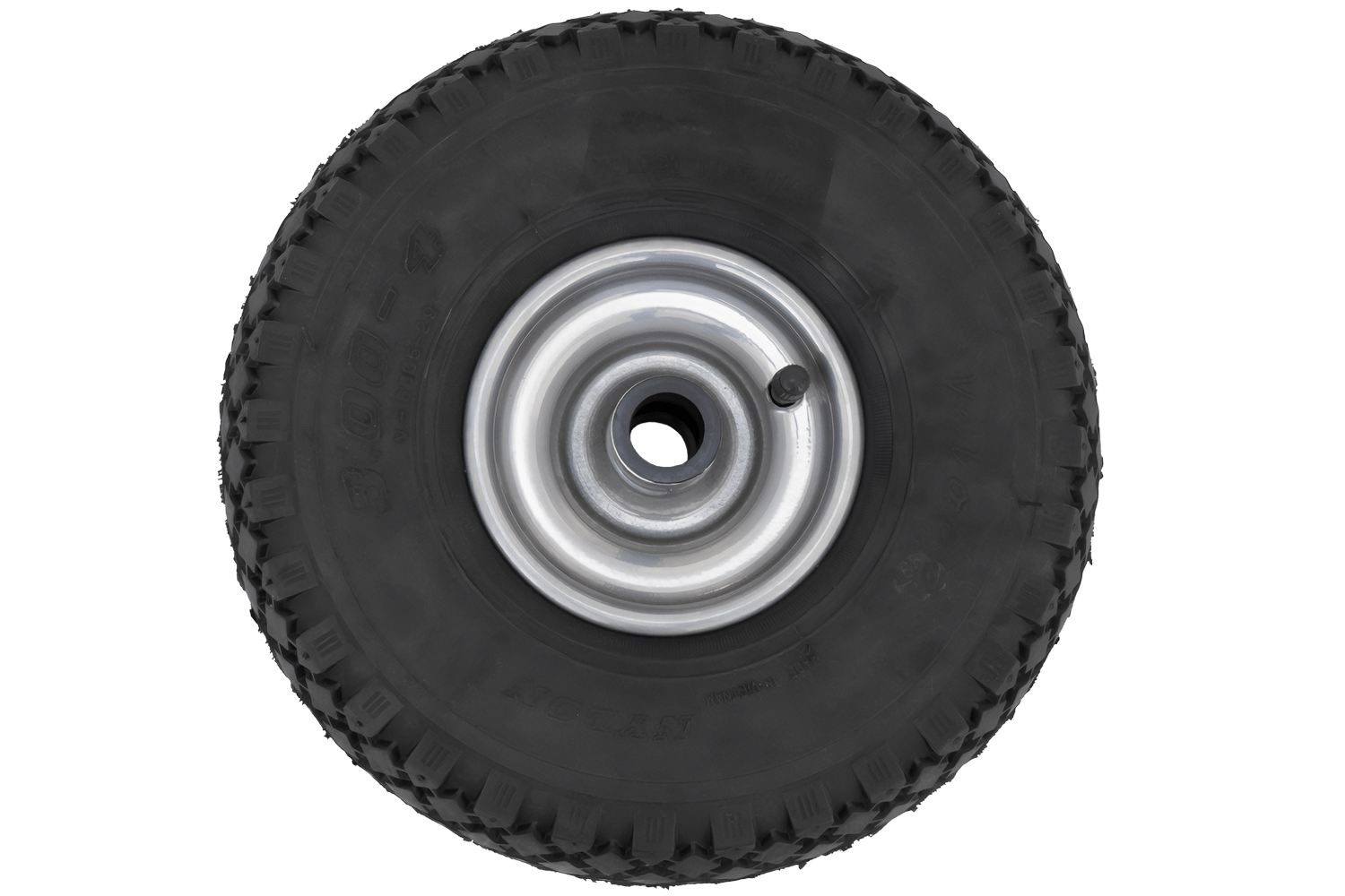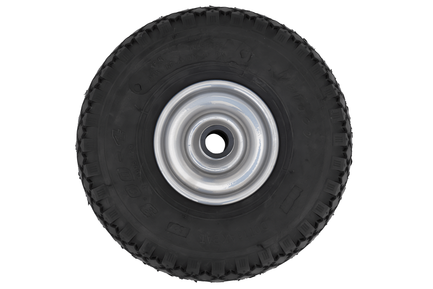 Dette er et reservehjul, pneumatisk dekk, designet for tilhengerhjul . Felgen av metallplate og plastlagrene sikrer lett og korrosjonsbestandig drift, mens det pneumatiske dekket effektivt absorberer støt og forenkler jevn rulling av tilhengeren rundt i innkjørselen, hagen eller verkstedet.