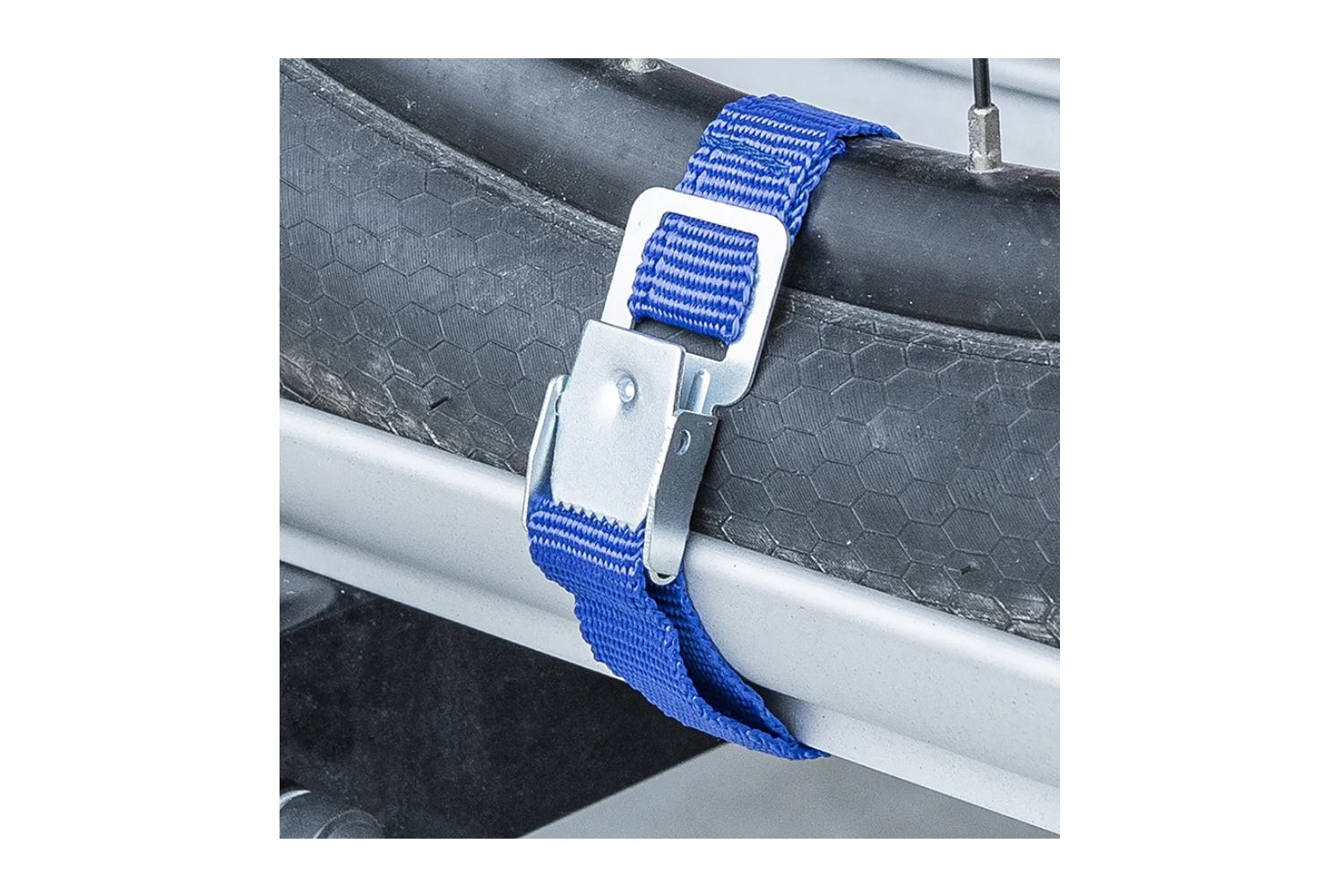 Dette produktet muliggjør rask og enkel festing av ramme eller hjul, noe som minimerer risikoen for at syklene forskyver seg under sykling. Stroppene er kun ment for lastsikring og skal ikke brukes til løfting eller bæring av last.